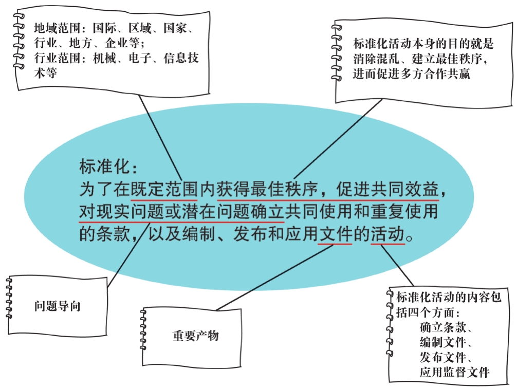 为了在既定范围内获得最佳秩序,促进共同效益,对现实问题或潜在问题确立共同使用和重复使用的条款,以及编制、发布和应用文件的活动(见图1)。