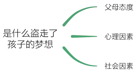 作为一个有着多年学生心理辅导经验的老师,我发现孩子的梦想“消失”的主要原因有三点:父母态度、心理因素、社会因素。