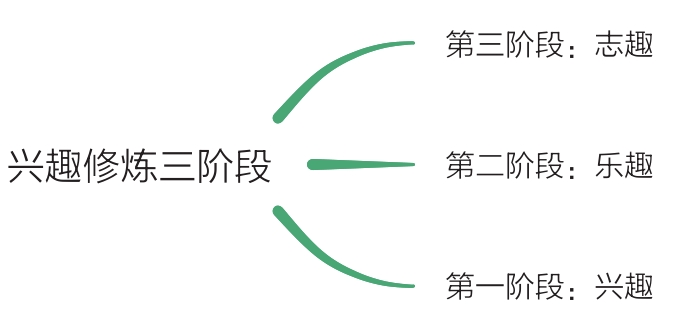 根据 兴趣修炼三阶段 模型, 兴趣是不断发展的 。如果孩子对某个事儿有兴趣,就可以发展为爱好,也就是我们常说的乐趣。而随着时间的投入,爱好加深与聚焦,就会转变为志趣,形成技能,变成孩子的职业向往。