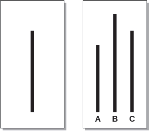 从众现象从另一个侧面解释了人类的非理性。即使面对长短相差很多的两条线,如果现场的很多人做出错误判断,那么你也会跟着做出错误判断。图中,A明显较短,B明显较长,C才是等长的正确选项。这是经典从众实验的发现。