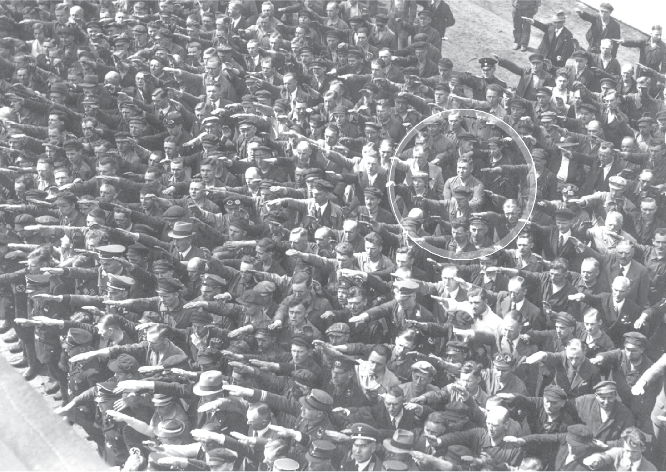 纳粹时代的德国,有这么一张颇具戏剧性的照片(摄于1936年德国汉堡),人群中有一个人拒绝行纳粹礼。他本来对纳粹党非常忠诚,但是,因为他娶了一个犹太姑娘并有了两个女儿,纳粹针对犹太人的暴行激怒了他。他也因此被纳粹党开除并入狱。他的不从众行为,本质上是由个人恩怨带来的,或者说,是情绪性的。