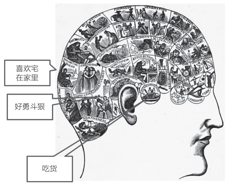 19世纪初德国解剖学家加尔(Gall)创立颅相学,认为脑型决定性格。事实证明根本不靠谱。