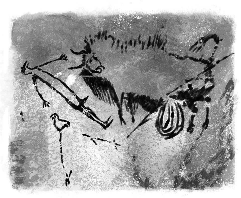 A lone human figure, wearing a bird mask, appears on the wall. He is being charged by a bison. The animal is injured. A spear is stuck in its belly. Its guts are spilling out!