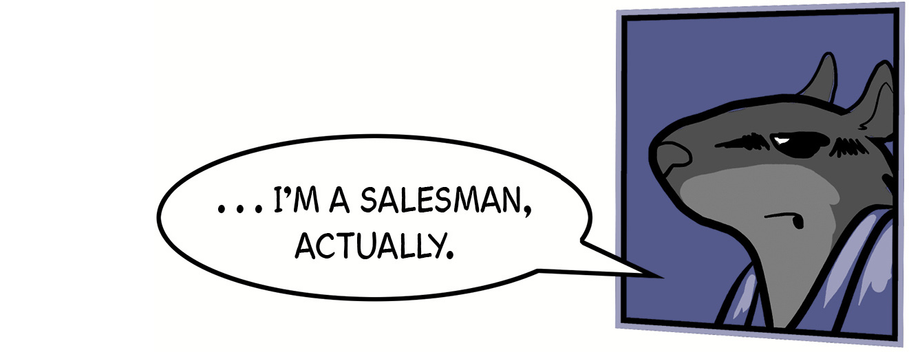 The cloaked figure had a striped face and appeared to be a chipmunk. “I don’t,” he admitted. “But you’re wearing a tiara, so you’re either a princess or you think you’re a princess, and I’m trying to sell you something here, so I’m happy to go along with your delusions.”