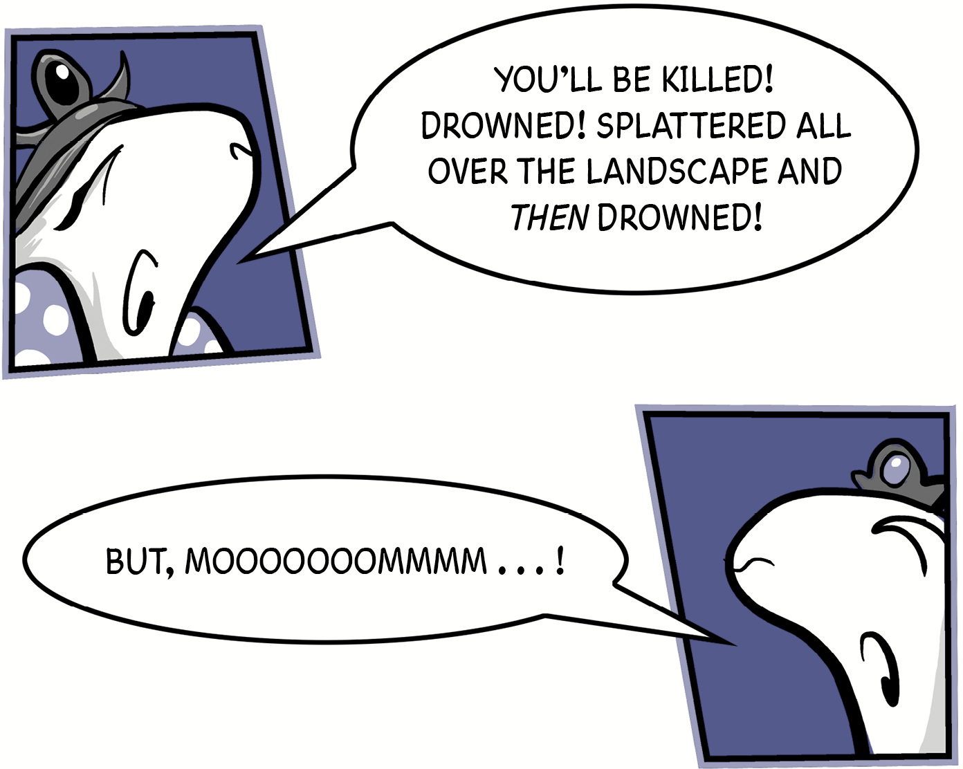 “It’s definitely magic too! I could feel it!” (There are approximately six thousand ways that one can cliff-dive wrong, almost all of which are fatal. Harriet had slipped on one of the jumps and the magic had actually swooped in, pointed her toes correctly, and gotten her lined up with the water in the proper fashion. This was why Harriet was not spread across the landscape as hamster jam. Did we mention that cliff-diving was a very dangerous sport?)
