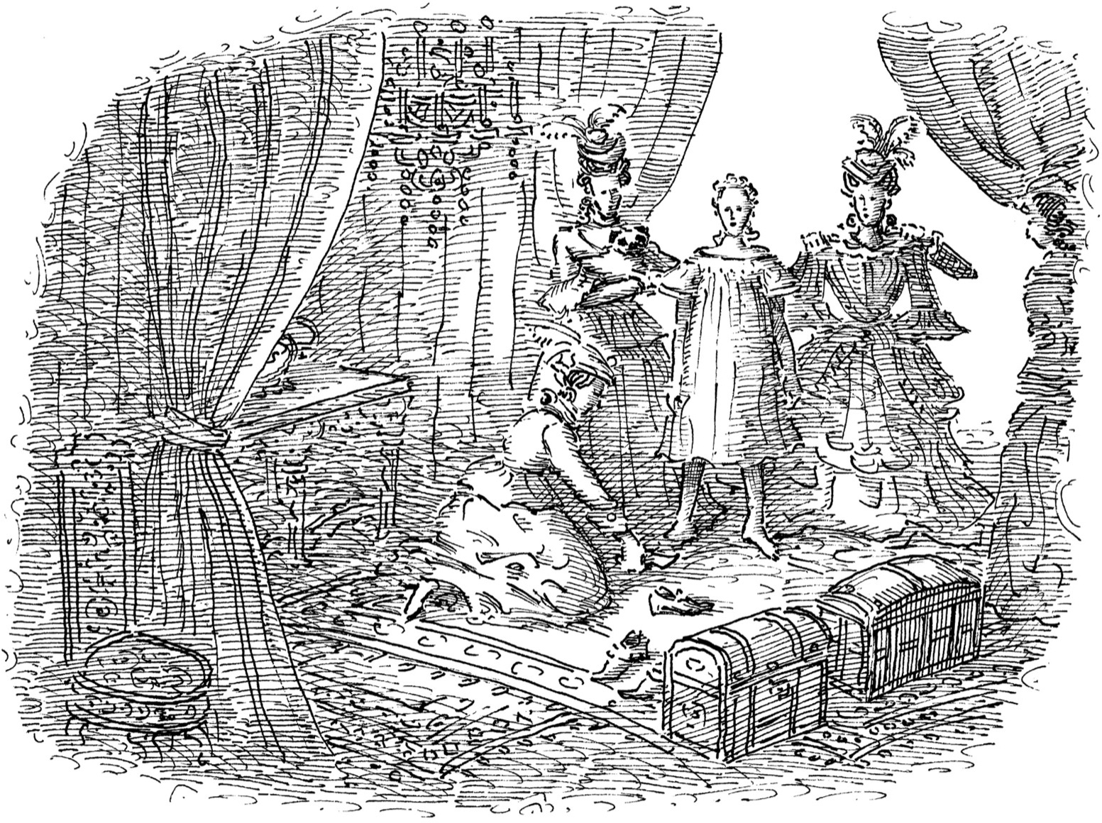The royal procession reached the Rhine River, where a new building stood on an island. Marie Antoinette said good-bye to the Austrian people who had traveled with her. When she entered the building, she had to take off all of her Austrian clothes. She was given a French gown made of golden fabric. She wasn’t allowed to bring anything from Austria into France, not even Mops, her little pug dog.