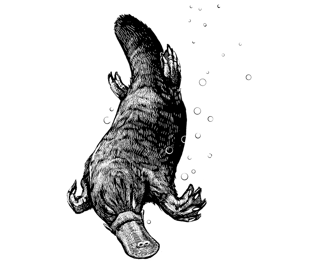 But when we’re talking evolutionary one-offs, there’s only one king. Venomous ankle spurs, luxurious pelt, the ability to detect the electrical discharges of their prey’s muscles with electroreceptors on their snout. Powerful flat tail, webbed feet, lays eggs. Bill like a duck. The world’s greatest animal, the duck-billed platypus, a mishmash of parts borrowed from throughout the animal kingdom. An animal so confused that when the first specimens arrived in England at the end of the eighteenth century, shipped from Sydney across the Indian Ocean, scientists searched for hours in vain to locate the stitches by which crafty Chinese merchants must have assembled their hoax.