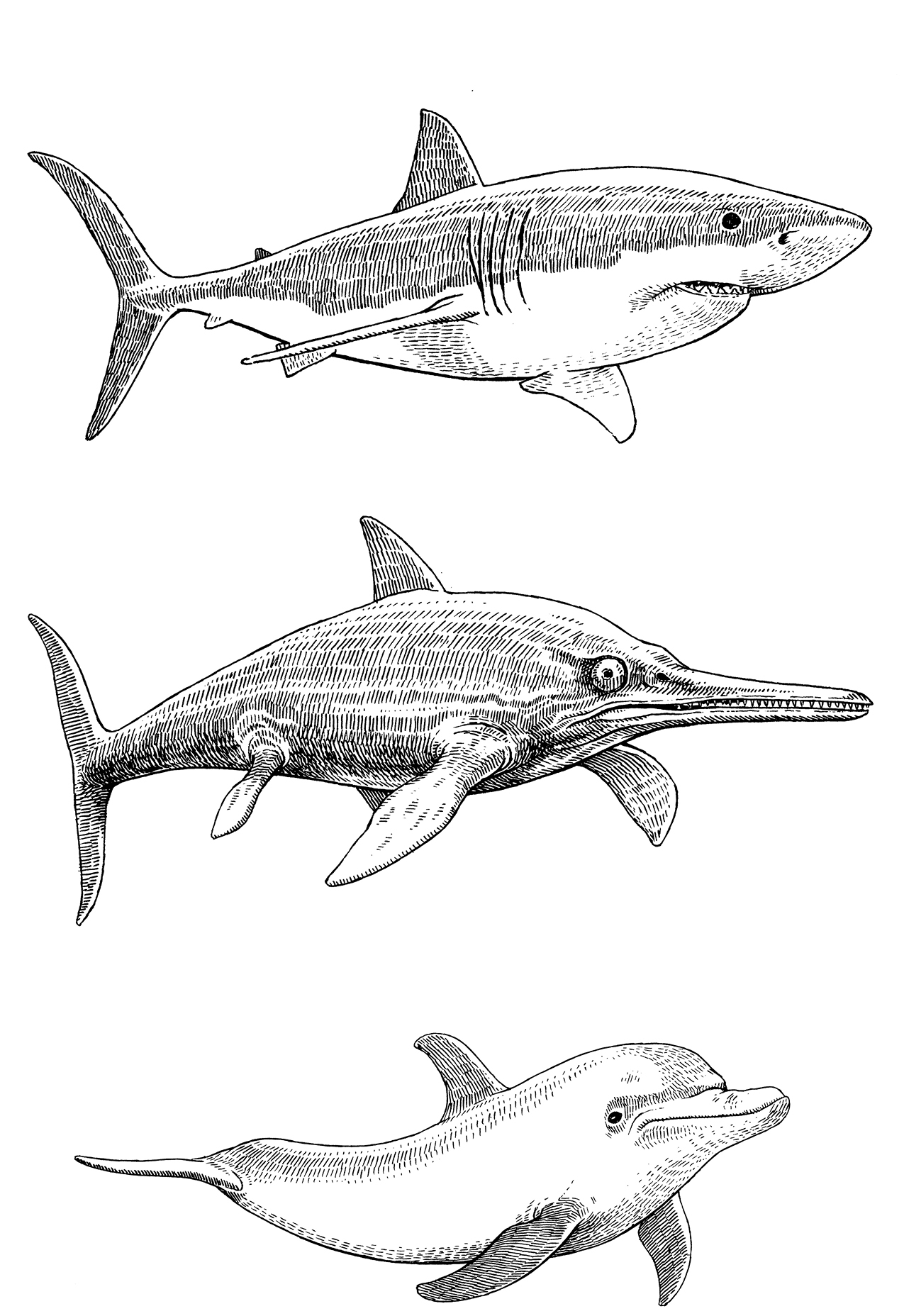 Shark (top), ichthyosaur (middle), dolphin (bottom)