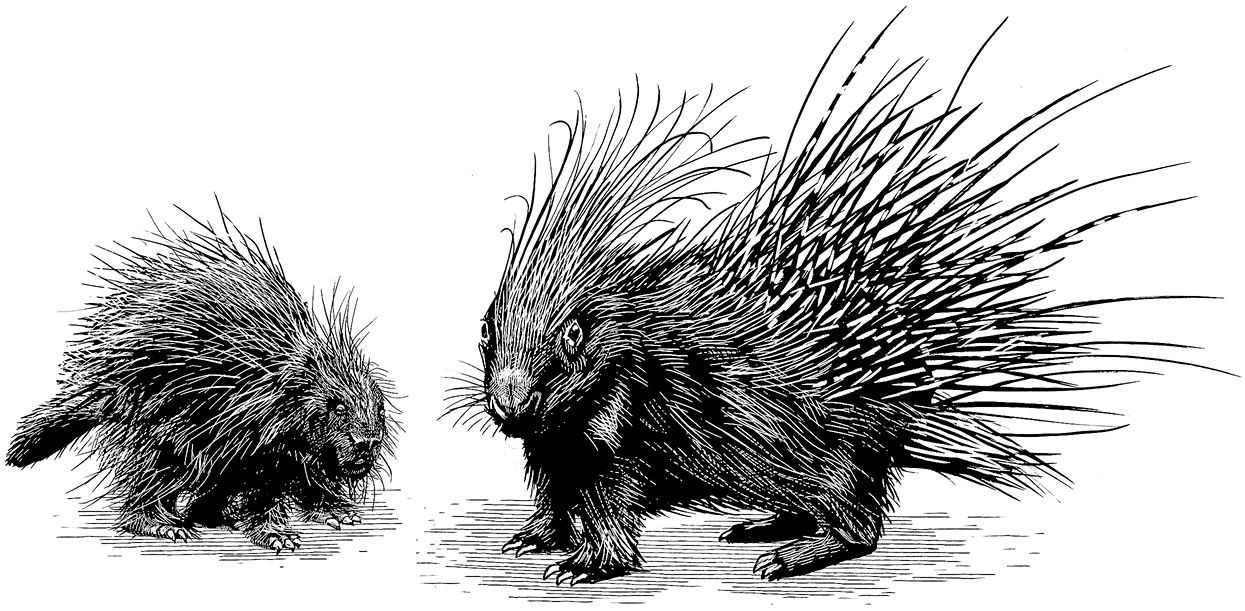 Certainly, there are differences among these species. The most obvious is size: the crested porcupine is twice the weight of its North American counterpart and thirty times that of the diminutive Rothschild’s porcupine from Panama. The quills correspondingly vary in length—fourteen inches in the crested, four inches in the North American, shorter yet in the Rothschild’s.