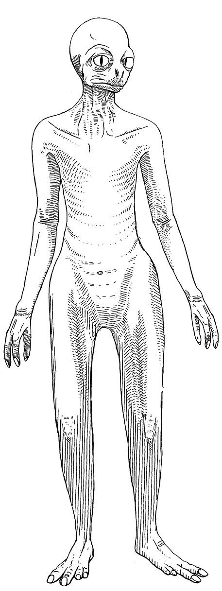 Russell went through a chain of logic to speculate what a modern-day descendant of Troodon would have looked like: larger brains require larger braincases; bigger braincases usually are associated with a shortening of the facial region; heavier heads are more easily balanced by placement directly on top of the body; this in turn favors an upright posture, which means that a tail is no longer needed as a counterweight to the no longer forward-leaning front half of the body. A few more assumptions about the best leg and ankle structure for walking upright and, voilà, what was termed inelegantly the “dinosauroid,” a green, scaly creature with an uncanny resemblance to a human, right down to the butt cheeks and fingernails.