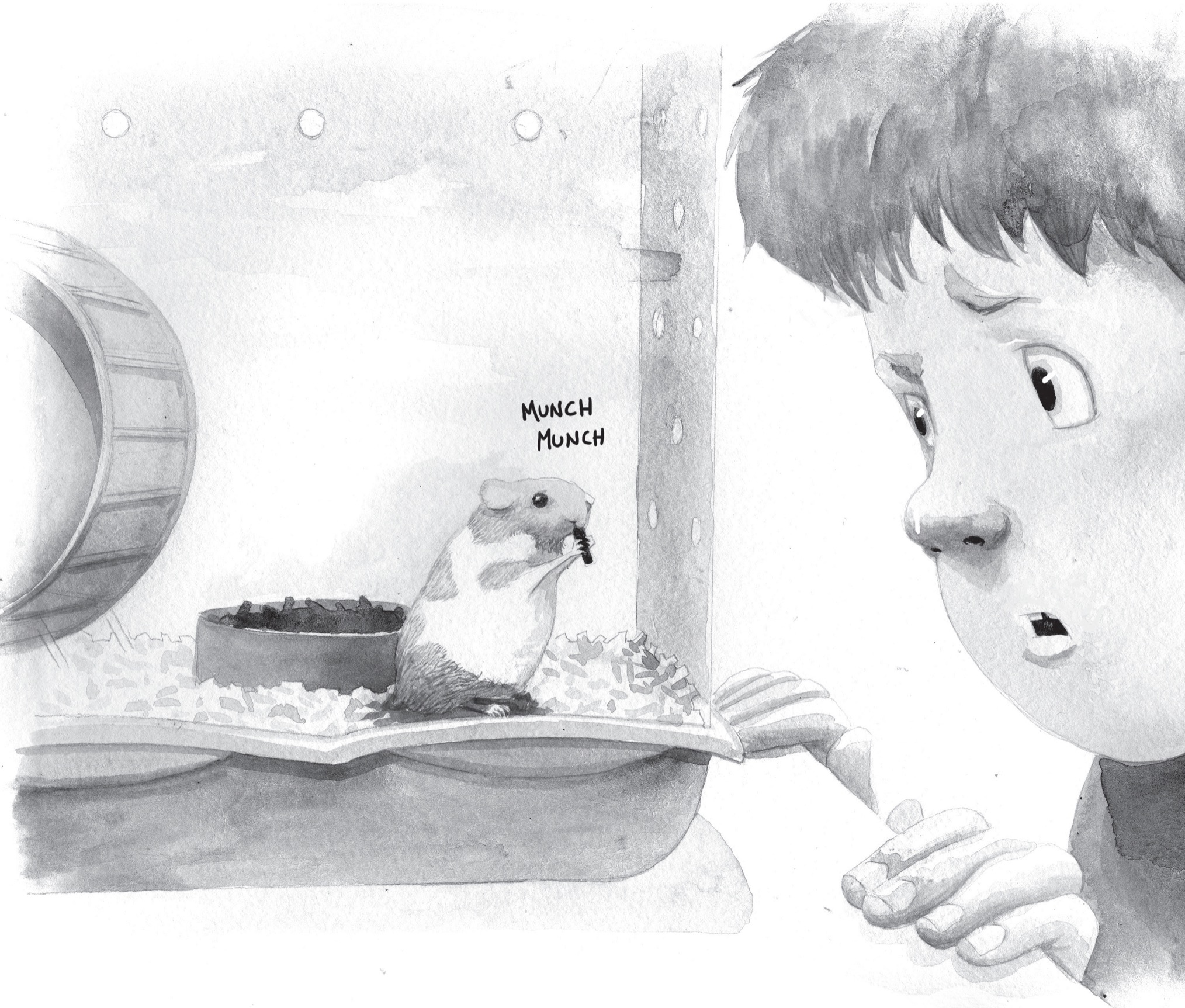 Alison’s eyes open wide. “He’s the class pet! You know, Chewy. The hamster,” she says, and points to the back of the room.