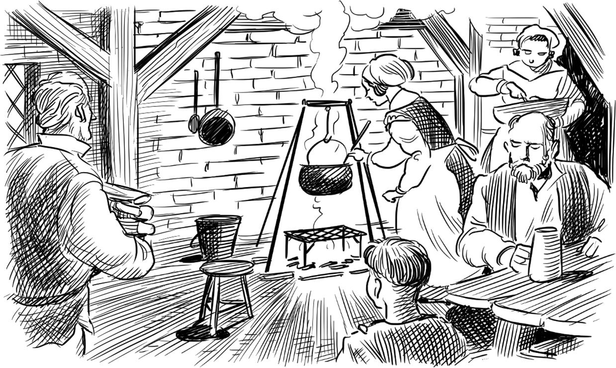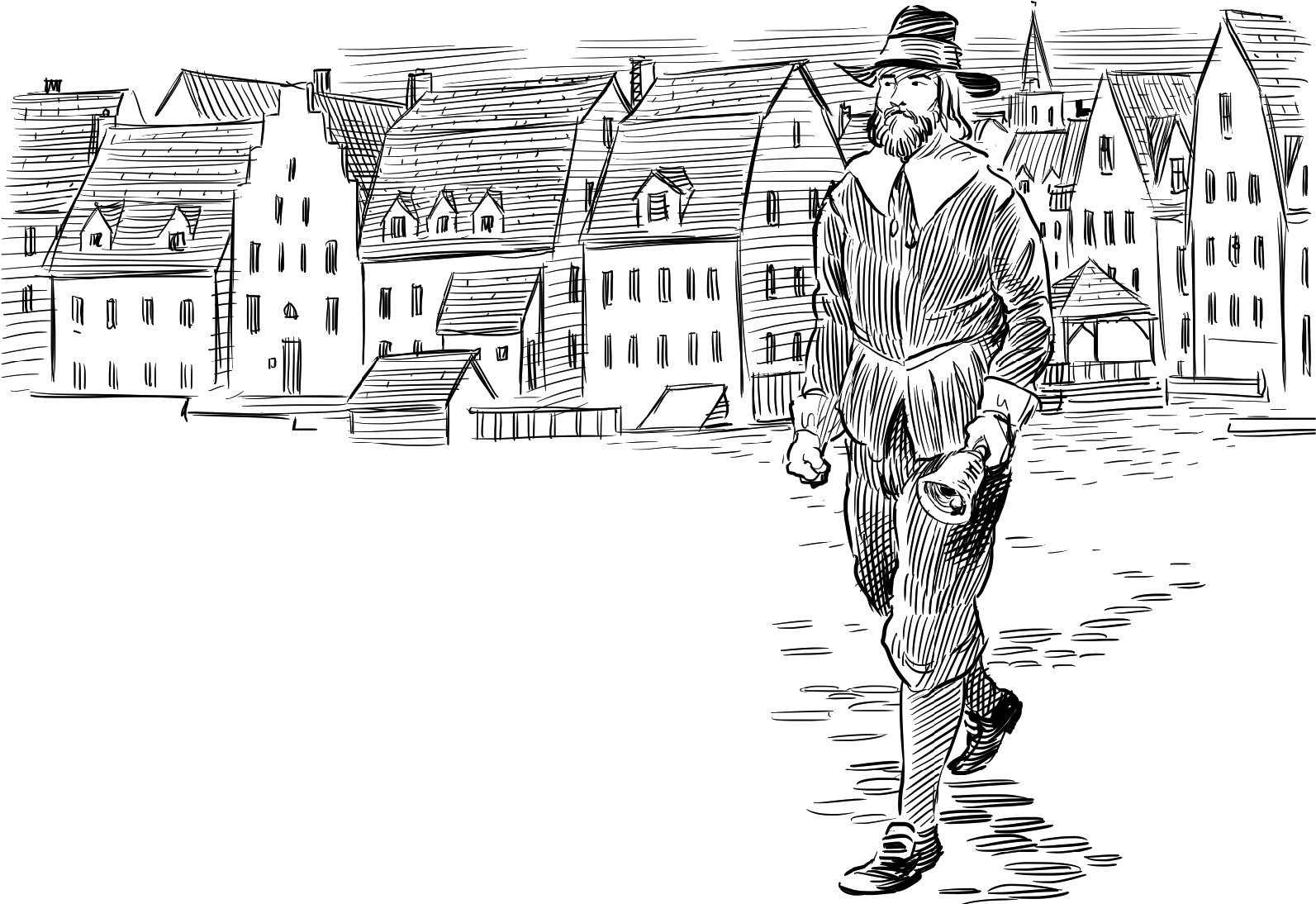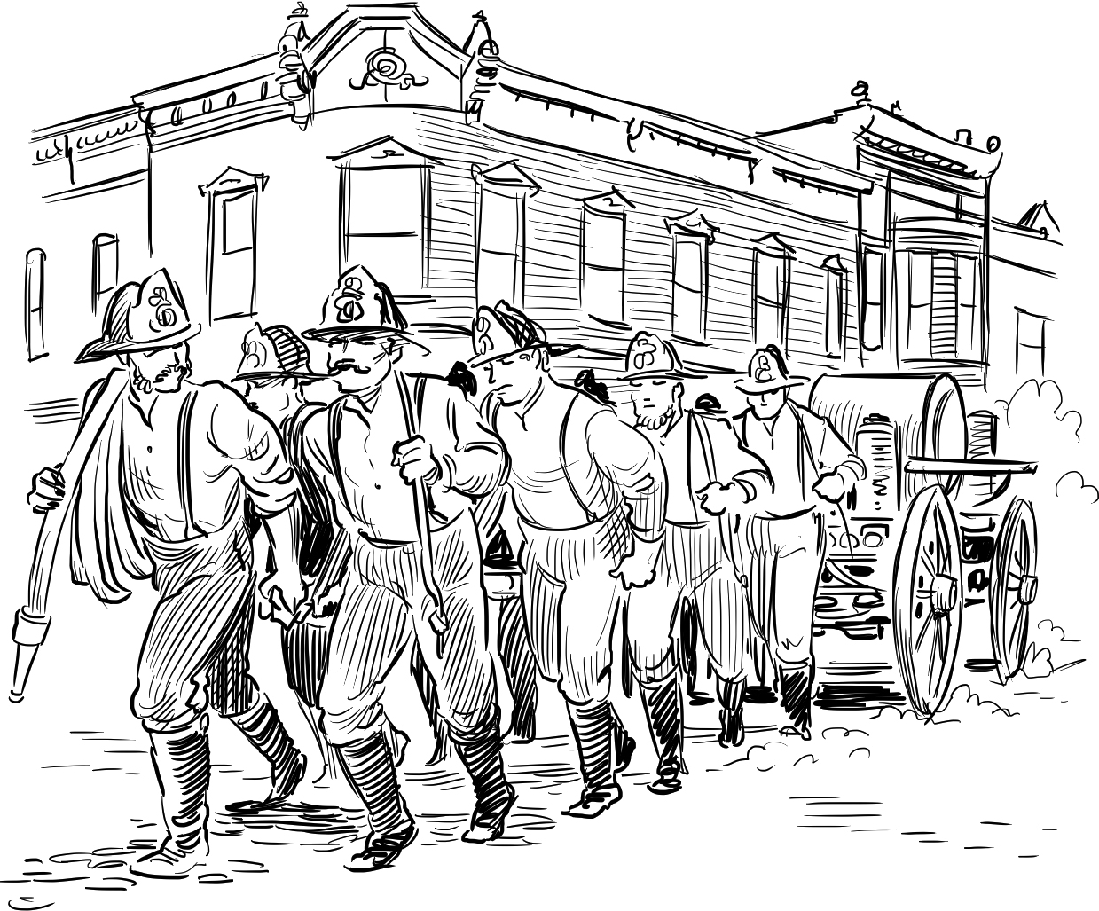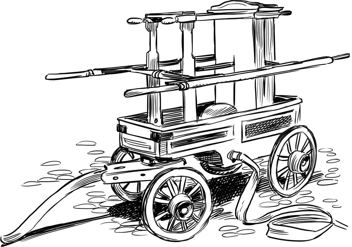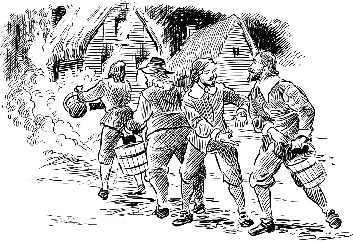 Firefighting was everyone’s business. If one house caught fire, all its neighbors were in danger. As soon as anyone saw a fire, they would sound the alarm. Then everyone in the village grabbed a bucket and rushed outside. They formed a double line from the fire to the nearest pond, river, or well. They filled buckets and passed them up the line to the fire. When the bucket was empty it was passed back down the line to get filled again. This was called a bucket brigade.