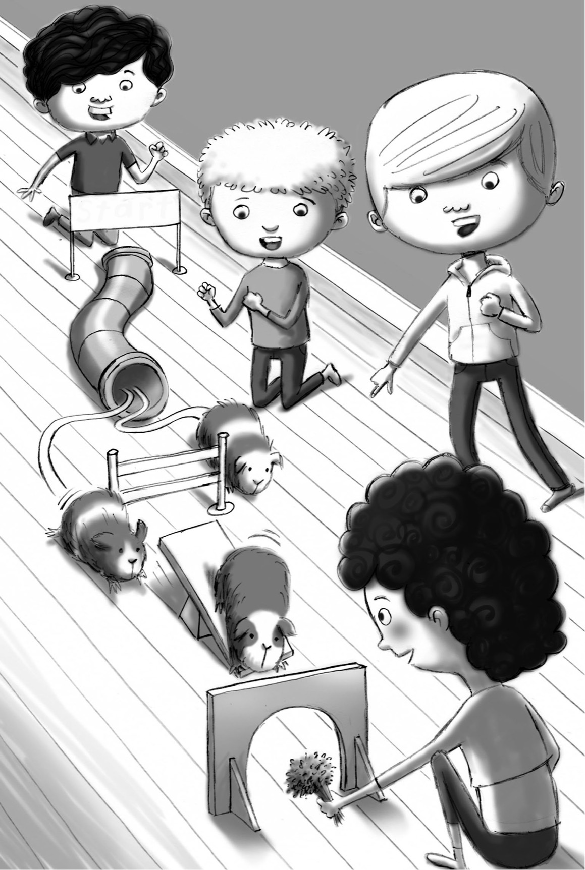 “Go, guinea pigs!” shouted Erin, a curly-haired girl the same age as Joe. She was sitting at the other end of the hall waving a bunch of parsley, while three guinea pigs raced through the obstacle course toward her, squeaking as they went.