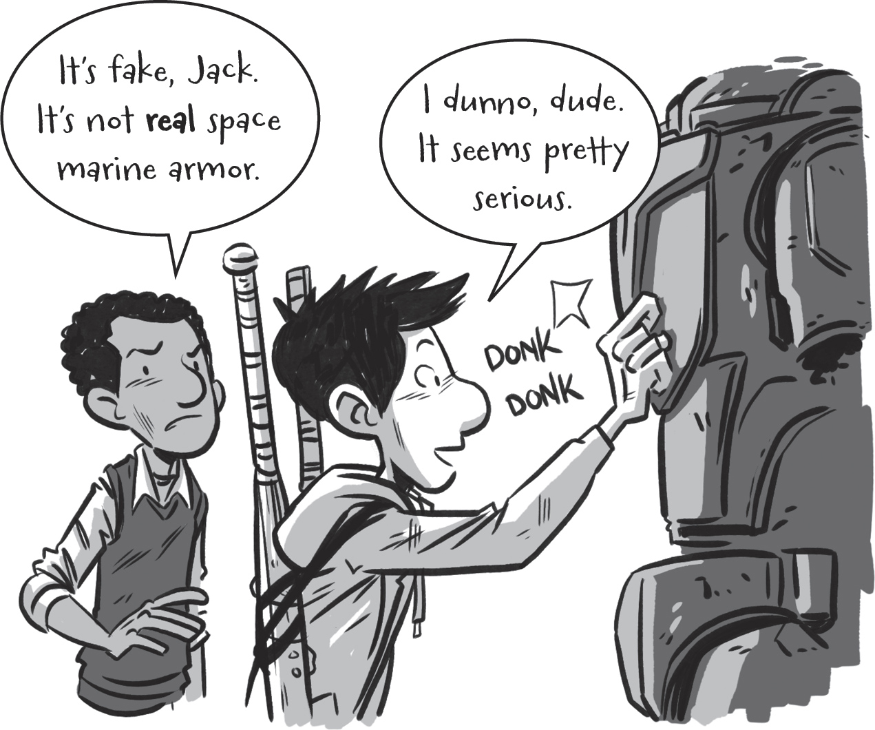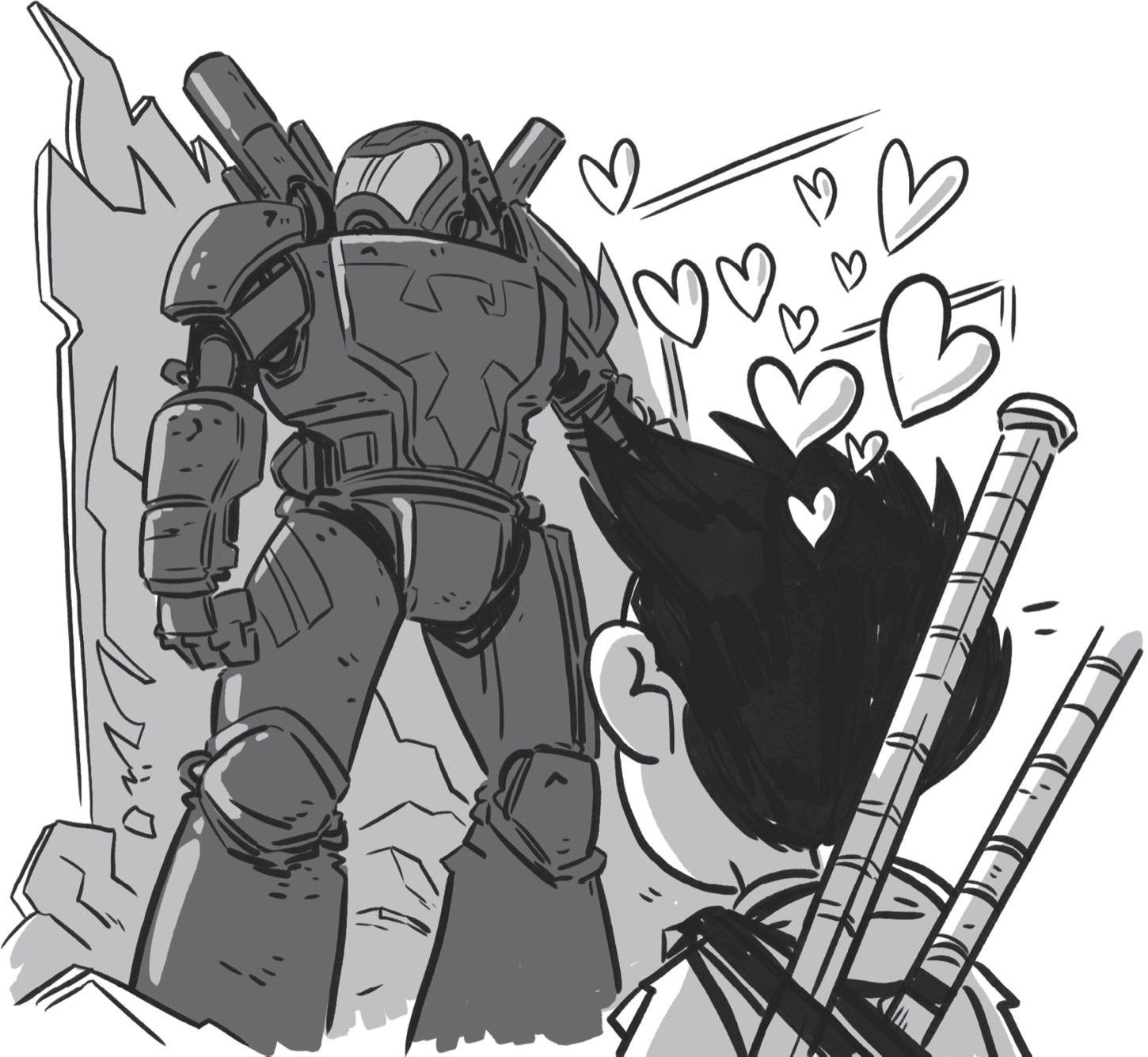 “I’m totally taking this,”I say.“I’ll be like an unstoppable space marine hero! I’ll stuff some bottle rockets in the side here—any monsters get close and VA-SHOOM! Eat rocket!”