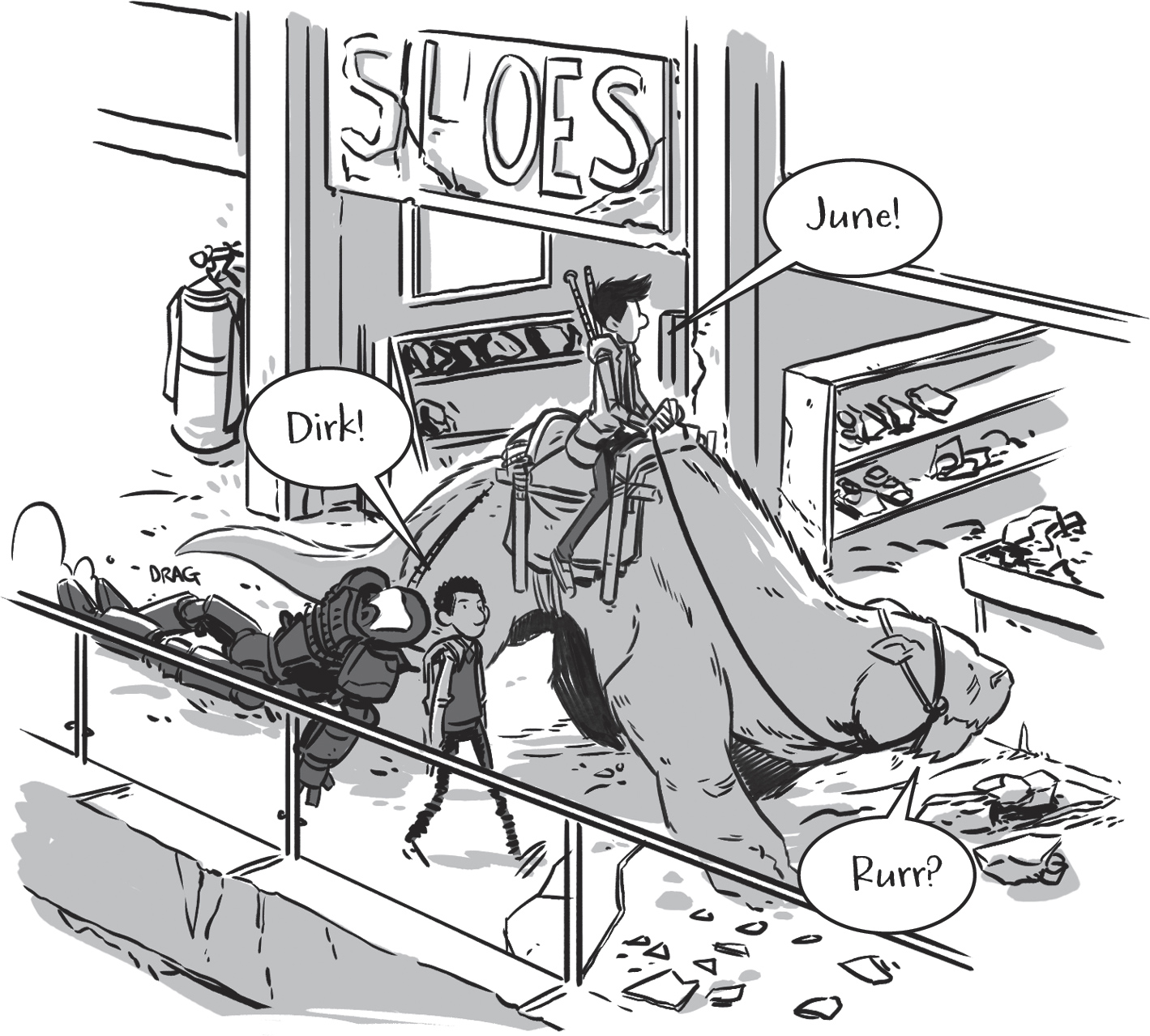 I take that split second, when there’s nothing but glass and metal in the air and wreckage in the worm’s face, to grab Quint and yank him into the closest store. We tumble over a display table and crash to the floor.