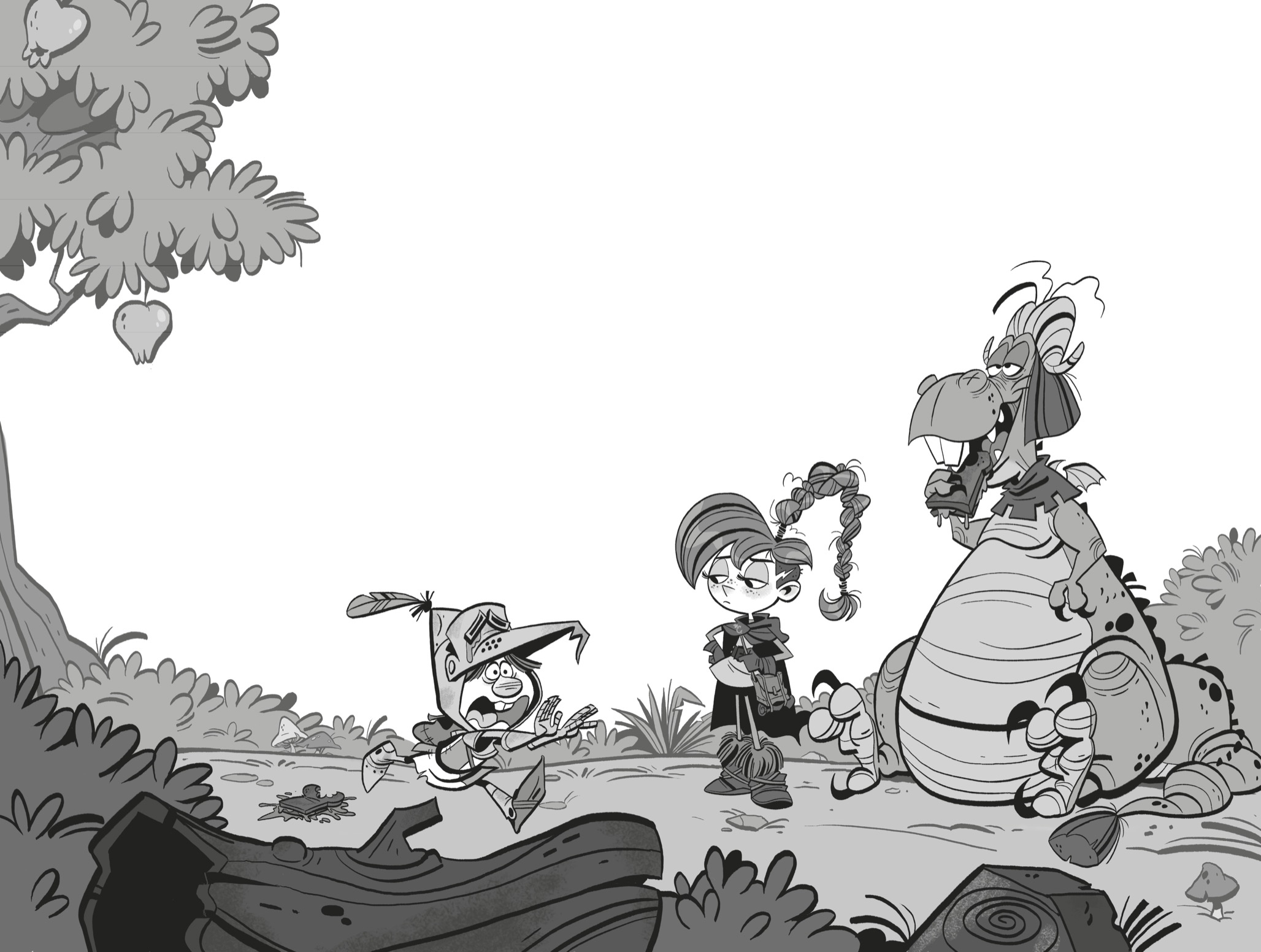 To an outsider, Dribble and Lucas probably didn’t seem like they would be very helpful. After all, Lucas was such a fraidy-cat, the other boys had nicknamed him Lucas the Lily-Livered and laughed him out of Knight School. And Dribble had been thrown out of his lair because the other dragons didn’t like that he used his fire for making grilled cheese sandwiches rather than burning villages.