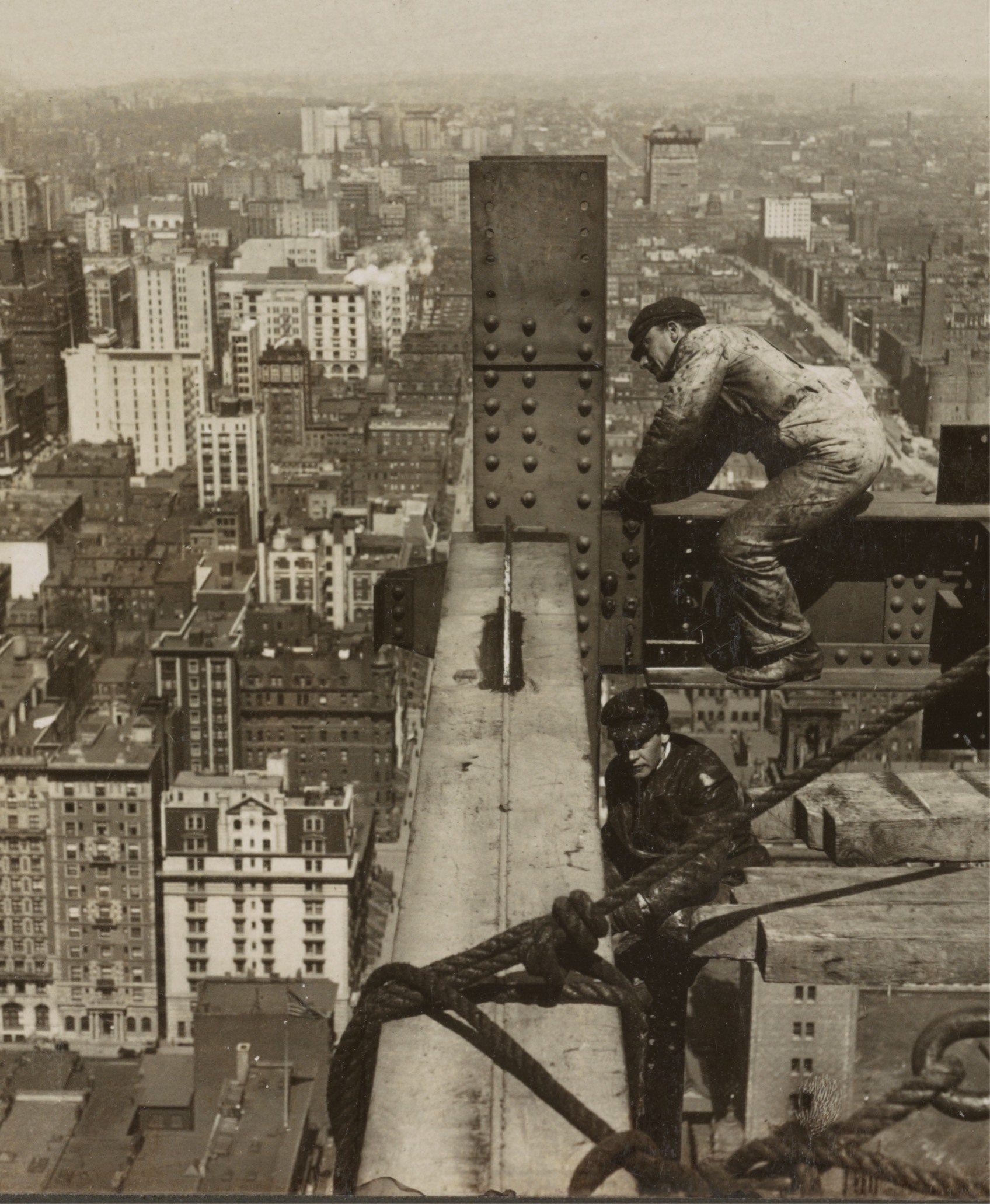 Construction workers build a skyscraper high above New York City's Fifth Avenue, circa 1908.