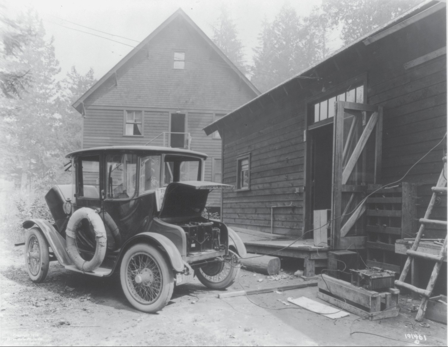 An electric car's batteries getting charged in Detroit, Michigan, circa 1919. Electric cars were originally developed in the 1890s.
