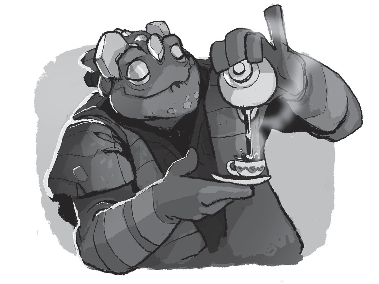 “Nonsense,” Knot said, finishing her cup. “You belong here just as much as anyone. Probably even more than them. You had to work your way here without any help. Besides, no reason for people to be rude. I mean, I get that we’re all strangers. But to be so cliquish on the first day?” The Grix daintily waved her massive slab of a hand in disgust. “Ugh. I have no patience for it!”