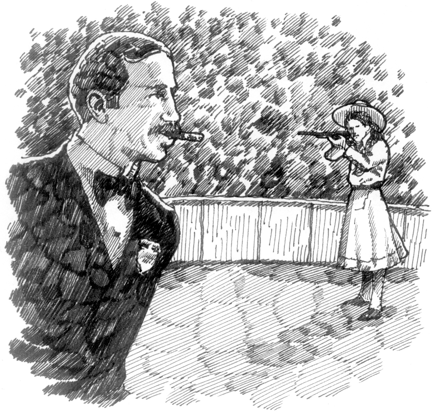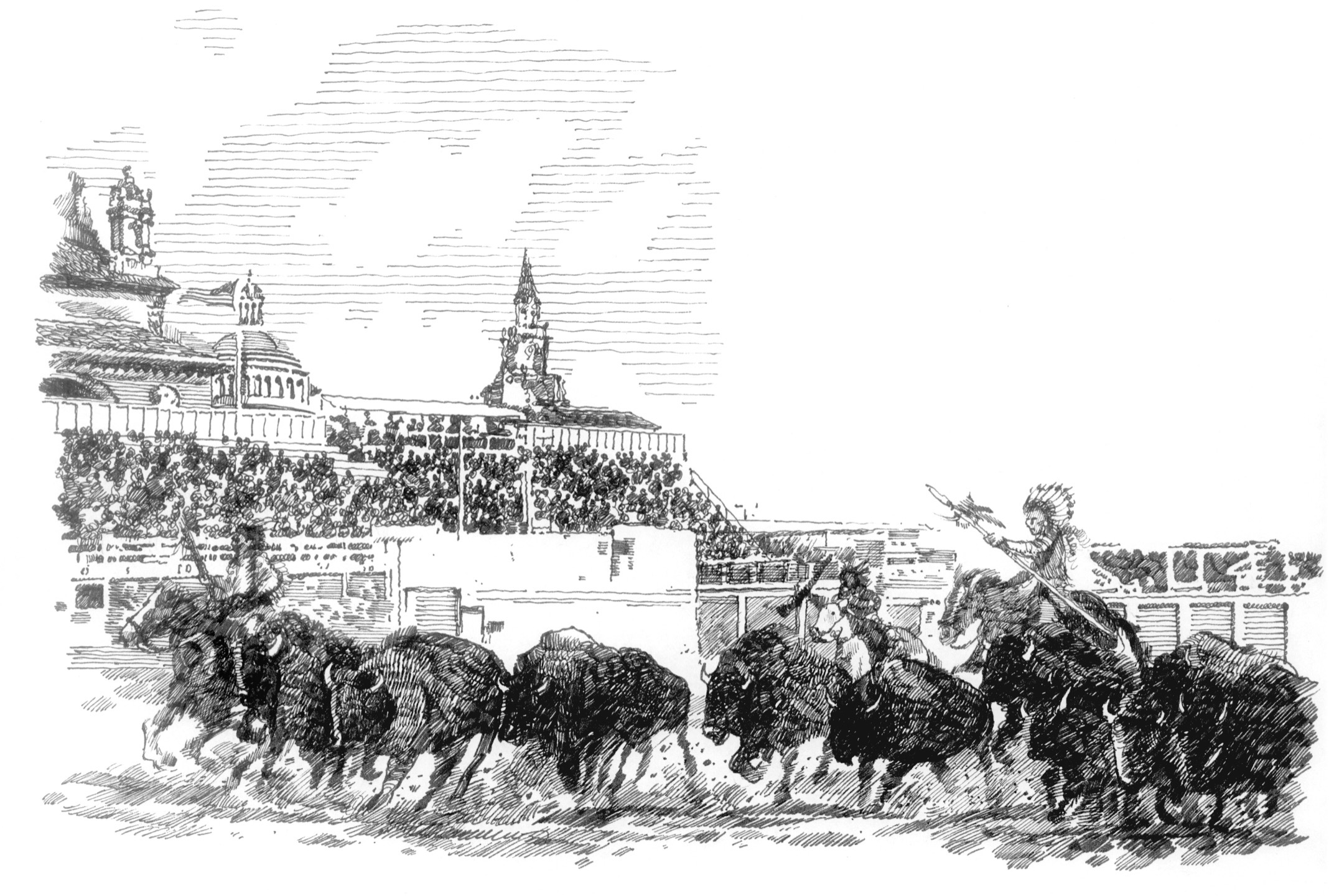 Indians on horseback hunted live buffalo. Bandits attacked an actual stagecoach. The famous sharpshooter Annie Oakley shot a cigar right out of her husband’s mouth. Cowboys rode bucking broncos and roped cattle. In the end, a band of Indian warriors attacked a pioneer settlement and were soundly defeated.