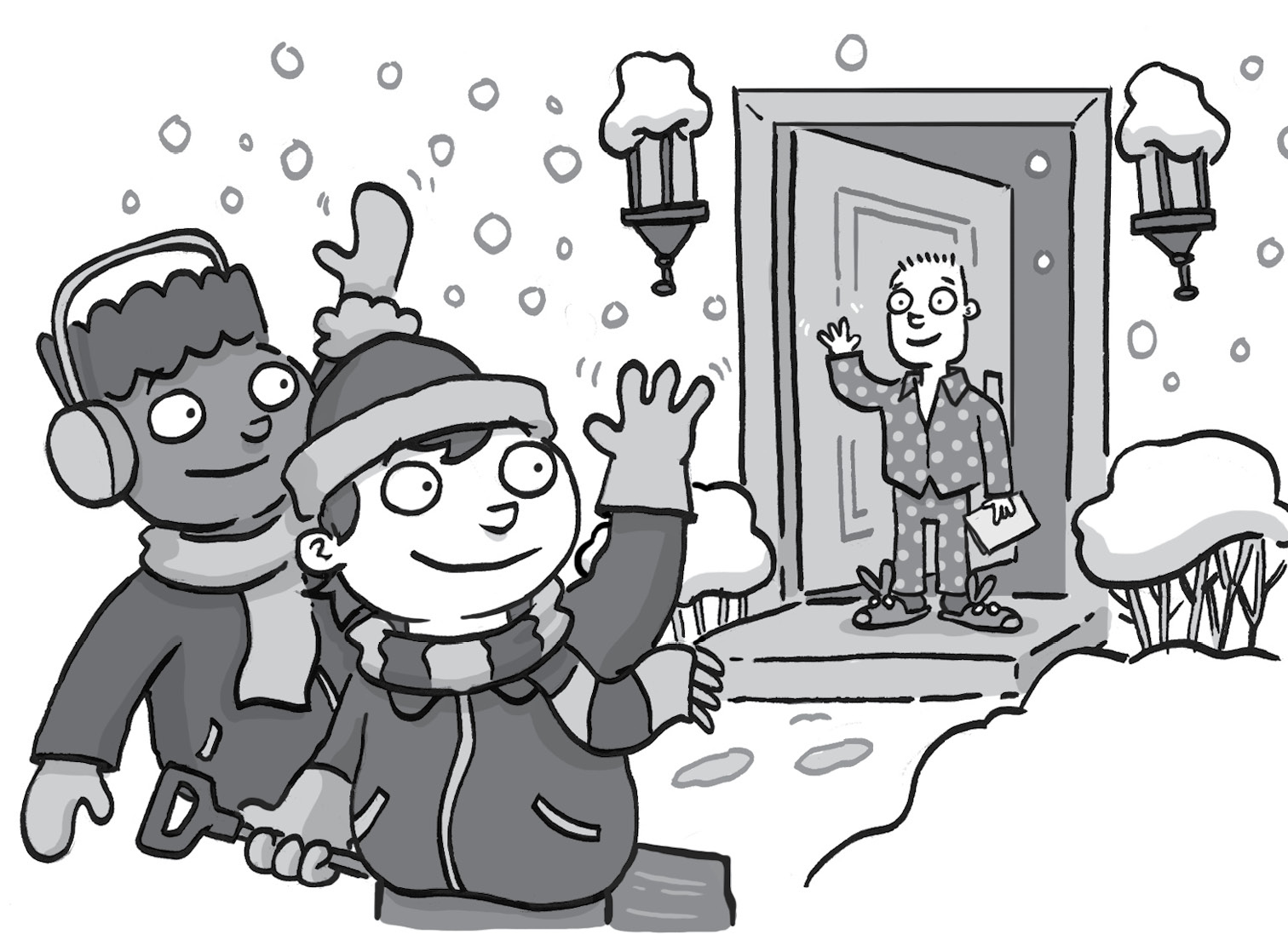 “You can’t shovel in those,” Alex told him. “Put on your snow pants . We’ve got to get to work before some other kids start a shoveling business.”