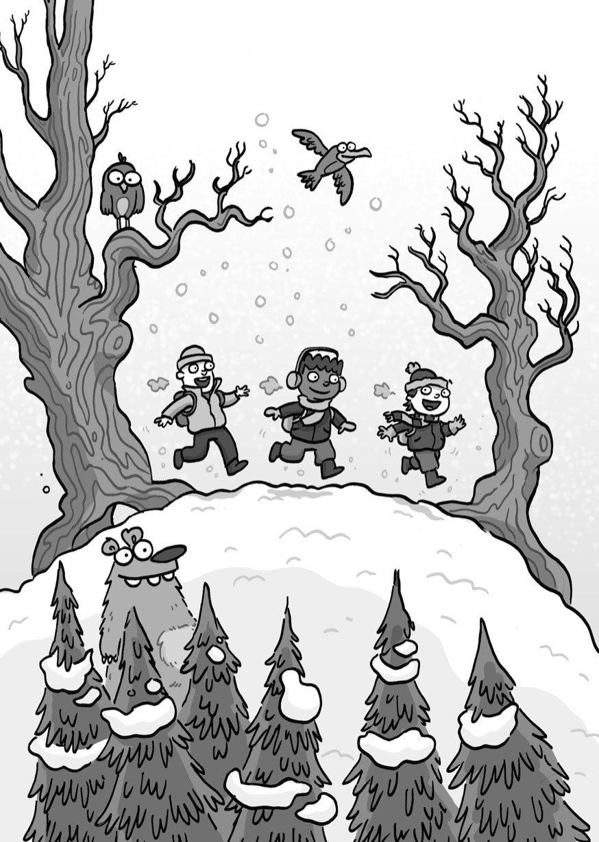 George nodded. “ Good luck with the comic,” he told Chris. “We’ll see you in school tomorrow.” He looked out at the mounds of snow and the gray clouds overhead. “If there is school,” he added. “You never know. It might snow again today!”