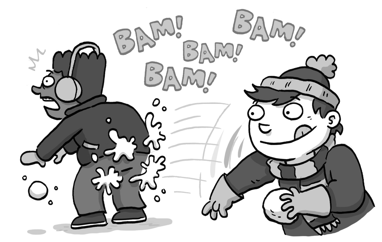 Bam! Bam! Bam! Bam! Before Alex could even stand up, George pelted him with four more snowballs—right in the rear end .