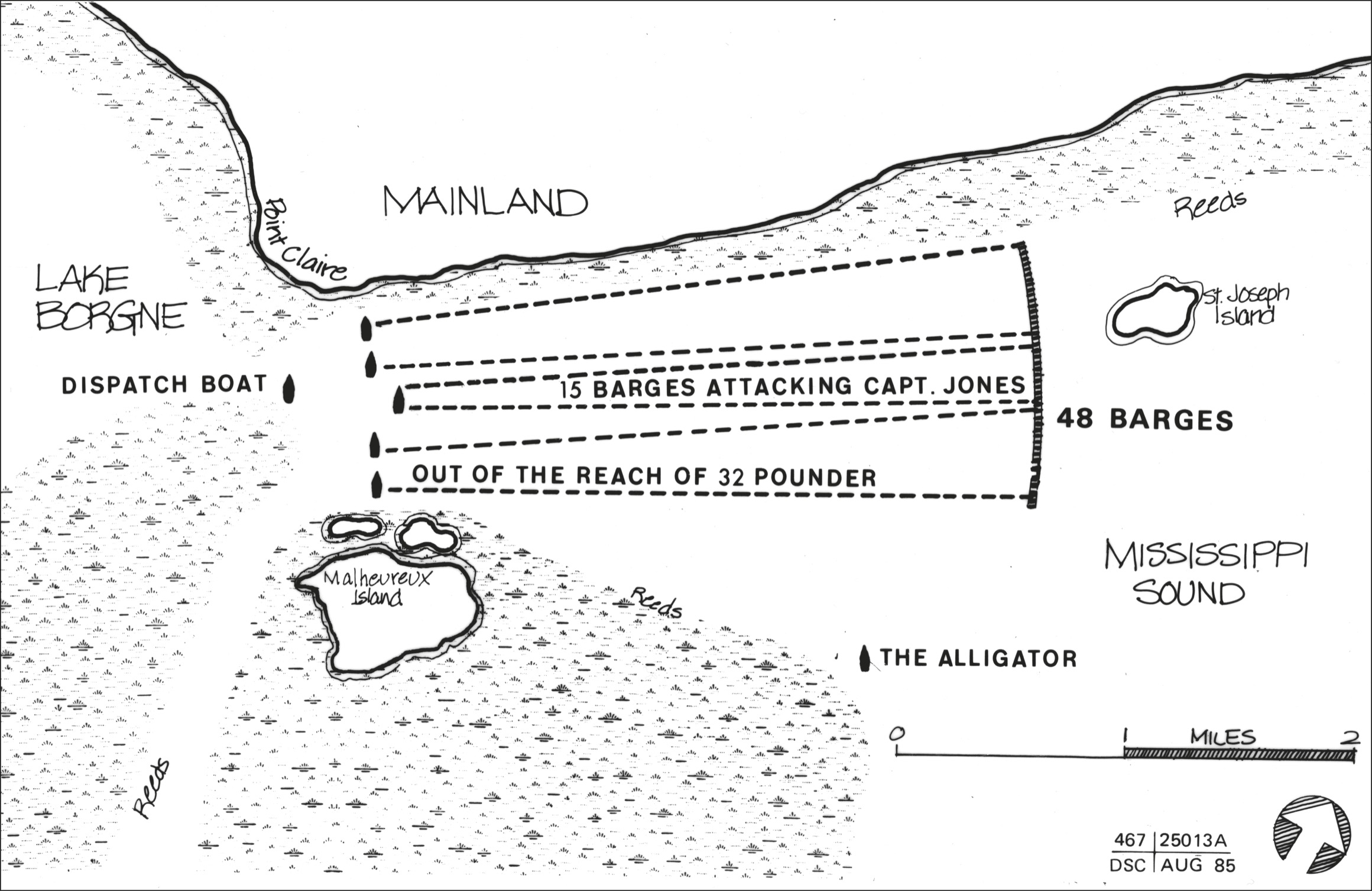 Jones struggled to make headway past midnight, but his wind failed entirely at one a.m., leaving the boats unmanageable, so he anchored the squadron at the west end of St. Joseph’s Island just off the Mississippi coast and directly north of the Malheureuxs. Unless the wind returned, and from the right direction, he would be stuck there in the morning with no option but to fight or yield. 73 That night he considered the virtual impossibility of resisting with any reasonable chance of success. His only advantage was the larger caliber and longer range of most of his cannon, but with now six boats against forty-five, and 190 men against 1,200, he had no hope of victory. Prudence suggested he should destroy his boats rather than risk their capture, then take his men overland to join Jackson’s army. He had sent warning to Patterson, which was all he could reasonably be expected to do now, but he believed he might barter bravery and blood here to delay the enemy for precious hours to allow Jackson to be ready. He could not do much against Lockyer, but he could buy time. 74