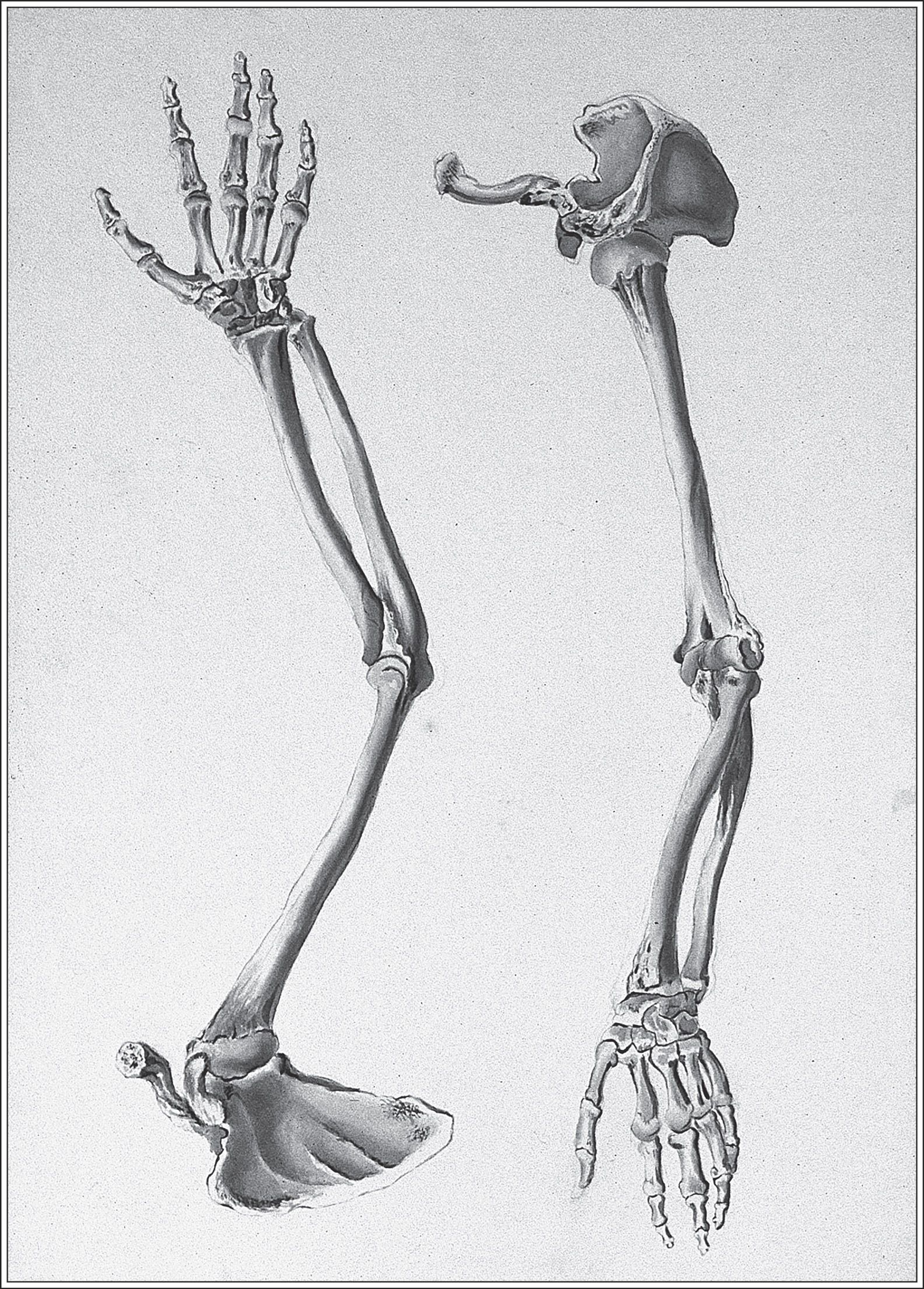 The anthropologist’s bones could have stayed in a drawer with his dogs. There are worse fates than that. But the idea for Written in Bone offered the opportunity to revive Krantz—or at least reassemble him—as a showstopper right at the end. So Smithsonian taxidermist Paul Rhymer was tasked with the job of fitting every little divot to its corresponding notch, creating a slightly altered X-ray version of a photo depicting a happy Clyde jumping to greet Krantz. (Rhymer had to change the positioning from that depicted in the photo to avoid giving the impression that Clyde was leaping to rip out Krantz’s throat.) The two formed an excellent study in the vertebrate form. Almost all the bones in Clyde had their correspondence in Krantz, two expressions of more than five hundred million years of vertebrate evolution.