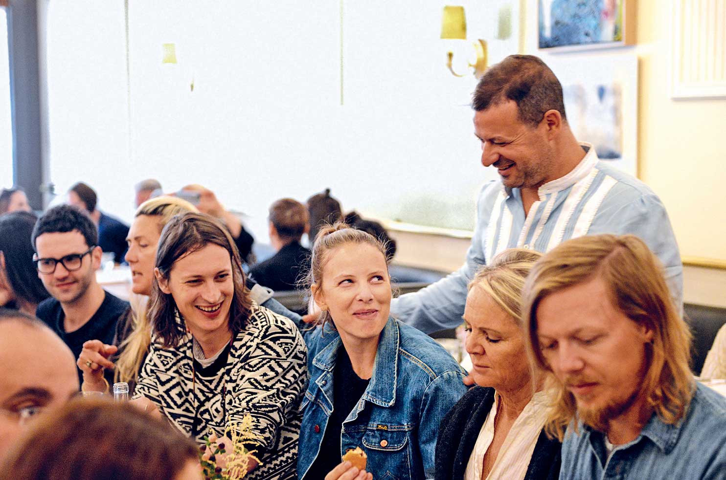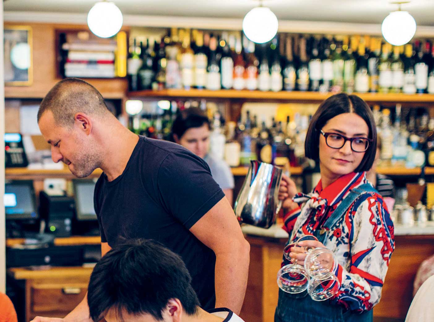 Today, a 7:00 A . M . staff meeting, scheduled ninety minutes before breakfast service begins, is the only quiet moment in the SoHo restaurant. “Hellos and good-byes are who we are,” Maya tells the servers for the hundredth time, as the puffy-eyed team sips coffee and nibbles quietly on the bagels and lox that Dean picked up the night before from Russ & Daughters. Some of the servers closed down the restaurant six hours earlier, while others are dressed in their striped-shirt uniforms with an eight-hour shift ahead of them. Remarkably, no one is cranky despite the early hour. “The door is an absolute priority for all of us,” adds Dean, picking up Maya’s sentence. “As always, we must remember to nurture our regulars and embrace the newbies. No one should ever come in here and feel we’re too busy for them. Be loose, confident, and generous in spirit.” Maya takes over for him, “And you guys know the drill: make sure the art is hanging straight and please keep an eye on things that need dusting.” The meeting continues like this for an hour, the owners reiterating the mantras of their successful formula. Julia describes a new dish they’re trying out on the menu called Maya’s Grain Bowl. The staff asks questions and discusses how best to handle the incident earlier in the week of a disgruntled neighbor, who pointedly rammed her bicycle into the crowd of people on the sidewalk waiting for brunch tables.