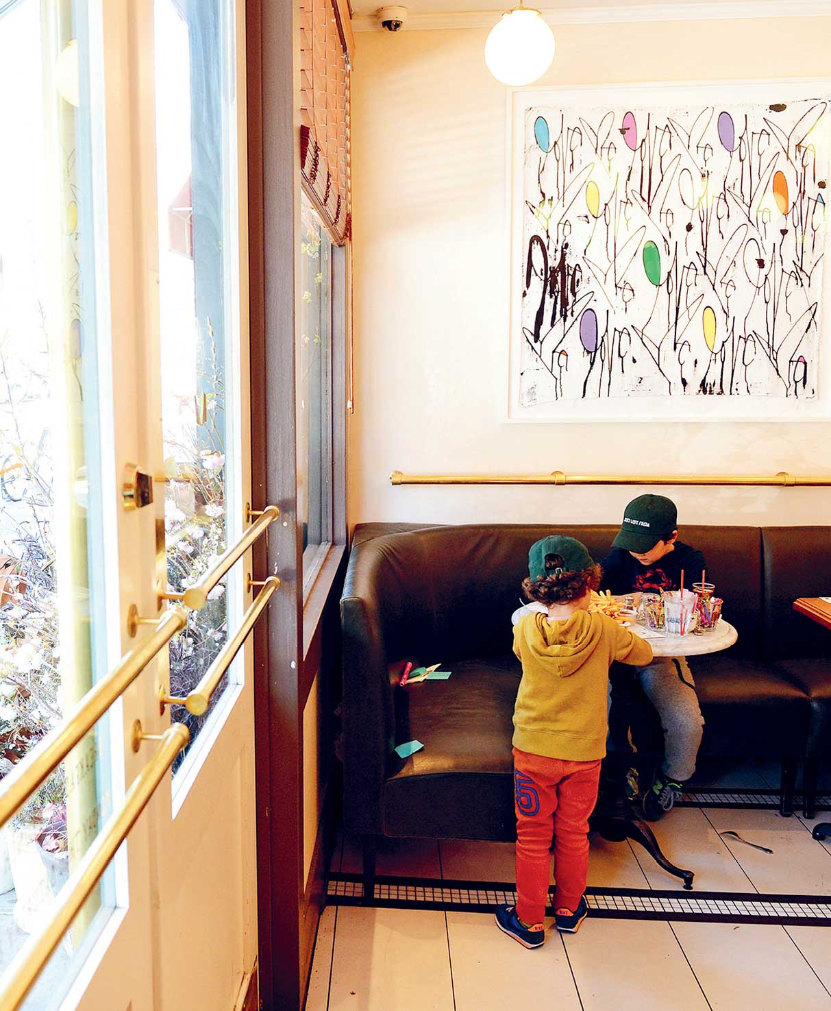 Regulars and neighbors started filling up the room with friendly faces from open to close. The fastidious French artist who lived upstairs was eating three meals a day at the restaurant, joined by her loft neighbor, a clean-cut Swiss single father and his five-year-old daughter drawing on the placemats. A handsome gray-haired man who Maya had introduced herself to on the street (months prior while collecting signatures for the community board) came to spend hours drinking rosé outside with his boyfriend, their Cavalier King Charles Spaniel waiting patiently by their feet. Here was the It Girl/DJ/clothing designer poring over e-mails while eating her grapefruit and yogurt. Installed at a corner table, sipping cappuccinos, a cane balanced on her lap, is the lady who taught art classes for the past three decades in the basement of the building next door. The brawny gym owners from around the corner ordered protein-heavy feasts of steak and whole branzino at 11:00 P . M . The dapper maître d’ from up the street came to the bar to chat with Maya while drinking a Negroni. They also befriended local artists who, in exchange for meals, donated artwork to fill the walls. The spirit of Freda traded in her twinkling costume jewelry and Elizabeth Taylor–esque bouffant for the likes of renowned painters in the downtown art scene, a graffiti artist, line drawings from a New Yorker cartoonist, and even one of Jack’s Wife Freda’s own waiters.