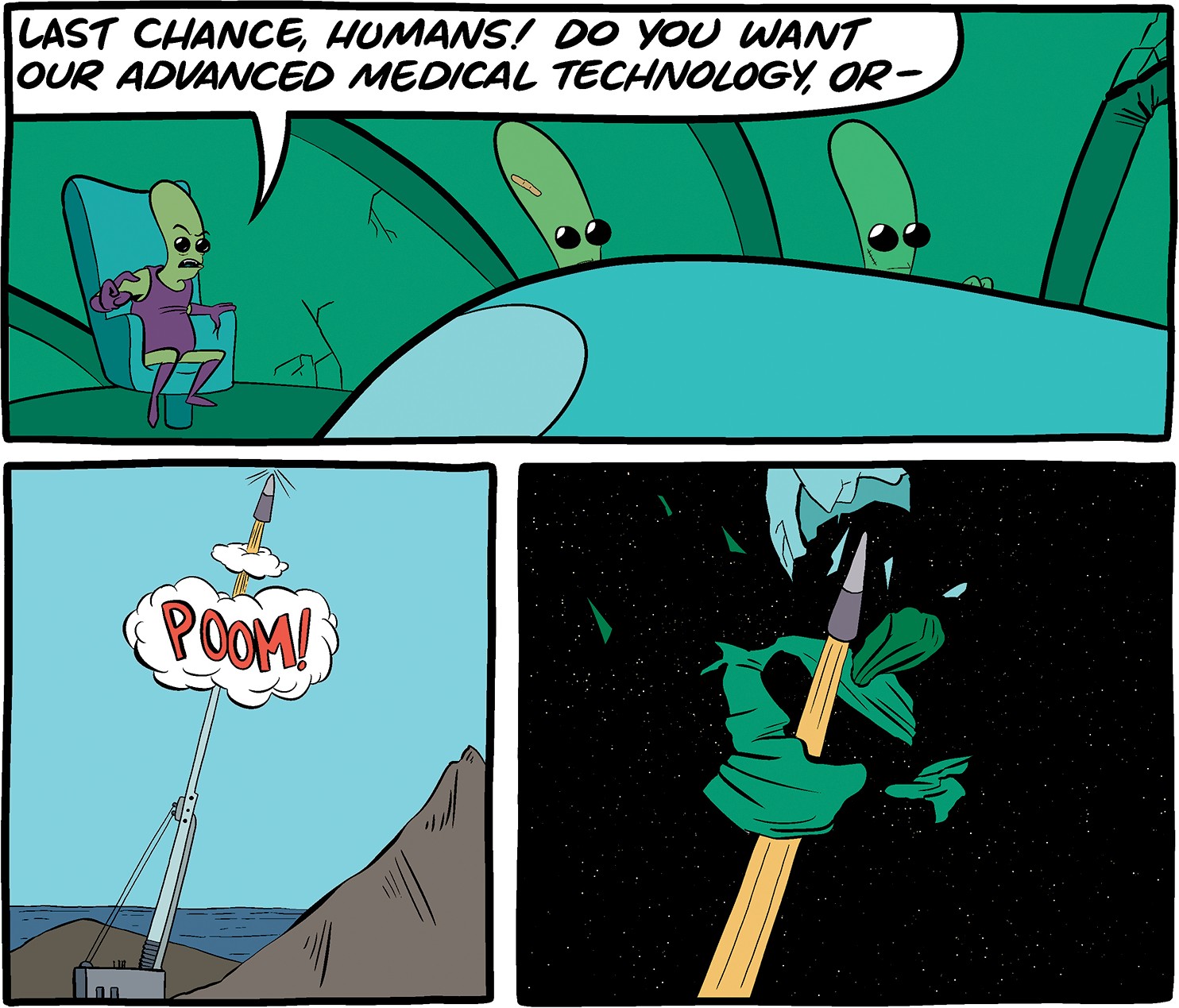 It could also help with global climate change. Scientists have estimated that just a few percentage points more cloud cover might entirely offset all the warming expected to occur over the next century. One way to artificially do this would be to launch a large screen to block some of the incident light. One day you may look up to a friendly dark patch floating in the sky, protecting you from catastrophe. Ideally, it would say something like “ FOR THE LOVE OF GOD, HUMANS! HOW COULD YOU LET THIS HAPPEN?! ” on the Earth-facing side.