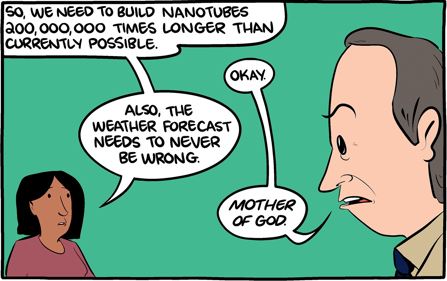 Even supposing we could get the fibers long enough, Mr. Derleth points out an issue for carbon nanotubes: “The material is very sensitive to electricity, and so if it ends up having a lightning strike happen, it will disintegrate a large portion of the ribbon.... Thankfully, there’s a solution to this; unfortunately, it’s not a very satisfactory one, intellectually. There is an area of the Pacific Ocean that has never had a recorded lightning strike. So you’d place your space elevator there. That’s the solution. Now if a storm came through, you would have a lot of worry.”