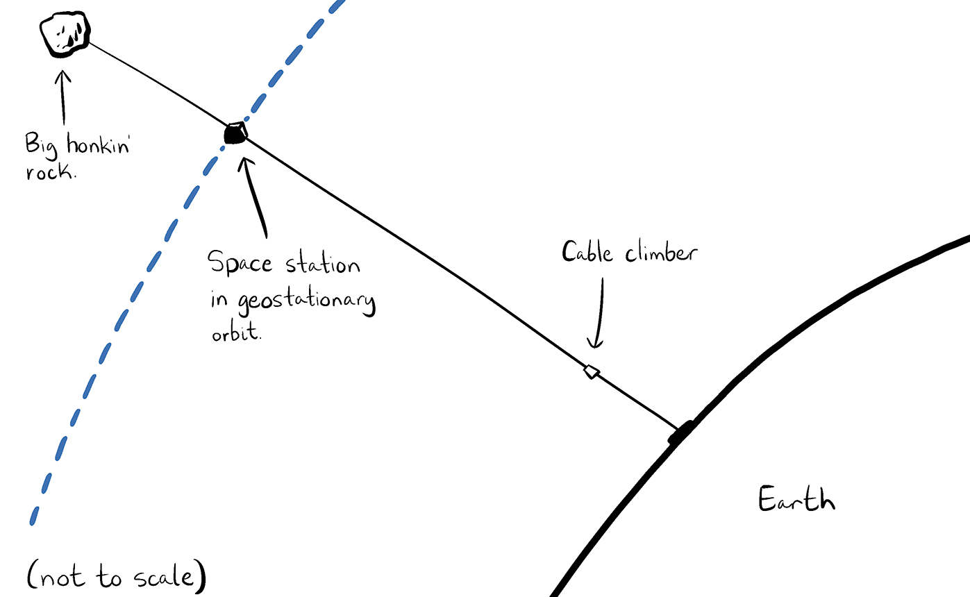 With respect to Earth’s equator, the space elevator never changes speed. It’s always turning around Earth once every twenty-four hours. But, as you go farther up the cable, you eventually reach the height at which the elevator’s speed of rotation matches the speed required for it to stay in free fall. This particular speed and distance is the geostationary orbit we referred to earlier, and it’s very special. If you toss out a sign that reads EARTH IS FOR BUTTHEADS , not only will it orbit forever, but it will stay at the same position in the sky for any observers. It’s too far to see any regular-sized objects with the naked eye, but any observer who points a telescope at the right point on a cool evening of stargazing will always see your douchey signage.