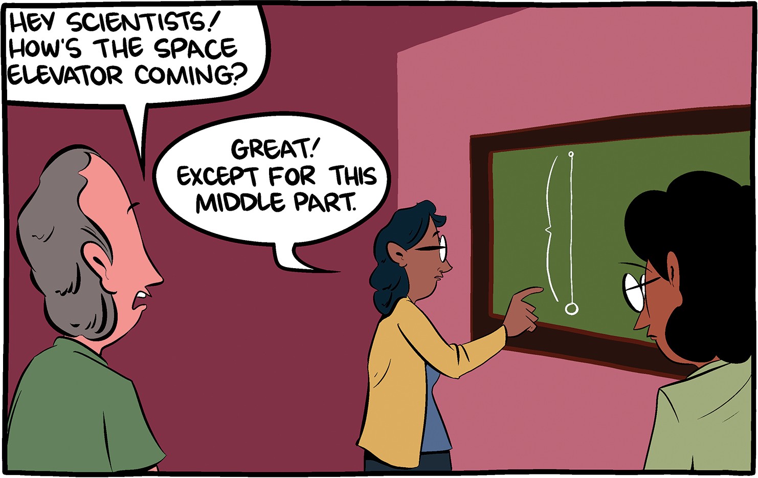 Even supposing we could get the fibers long enough, Mr. Derleth points out an issue for carbon nanotubes: “The material is very sensitive to electricity, and so if it ends up having a lightning strike happen, it will disintegrate a large portion of the ribbon.... Thankfully, there’s a solution to this; unfortunately, it’s not a very satisfactory one, intellectually. There is an area of the Pacific Ocean that has never had a recorded lightning strike. So you’d place your space elevator there. That’s the solution. Now if a storm came through, you would have a lot of worry.”