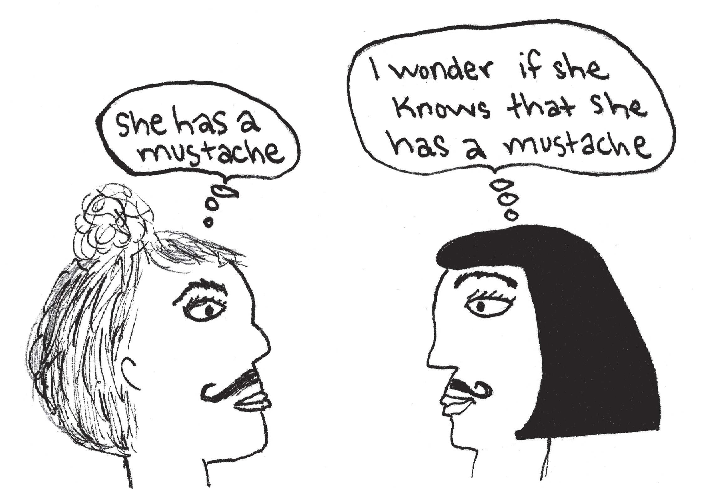 How many people had noticed my “blond mustache” and didn’t tell me? I tried to recall different boyfriends and situations. I’d kissed plenty of boys by then. Had they gotten mustache burn from my face? Is that why Sam didn’t ask me on that second date? Or Jonathan? Or Bill? Is that why that cashier at Vons, the grocery store, was looking at me strangely when I bought razors for my legs? How did I not realize that with my olive skin tone, bleaching my hairs until they were practically white might create a situation on my face?