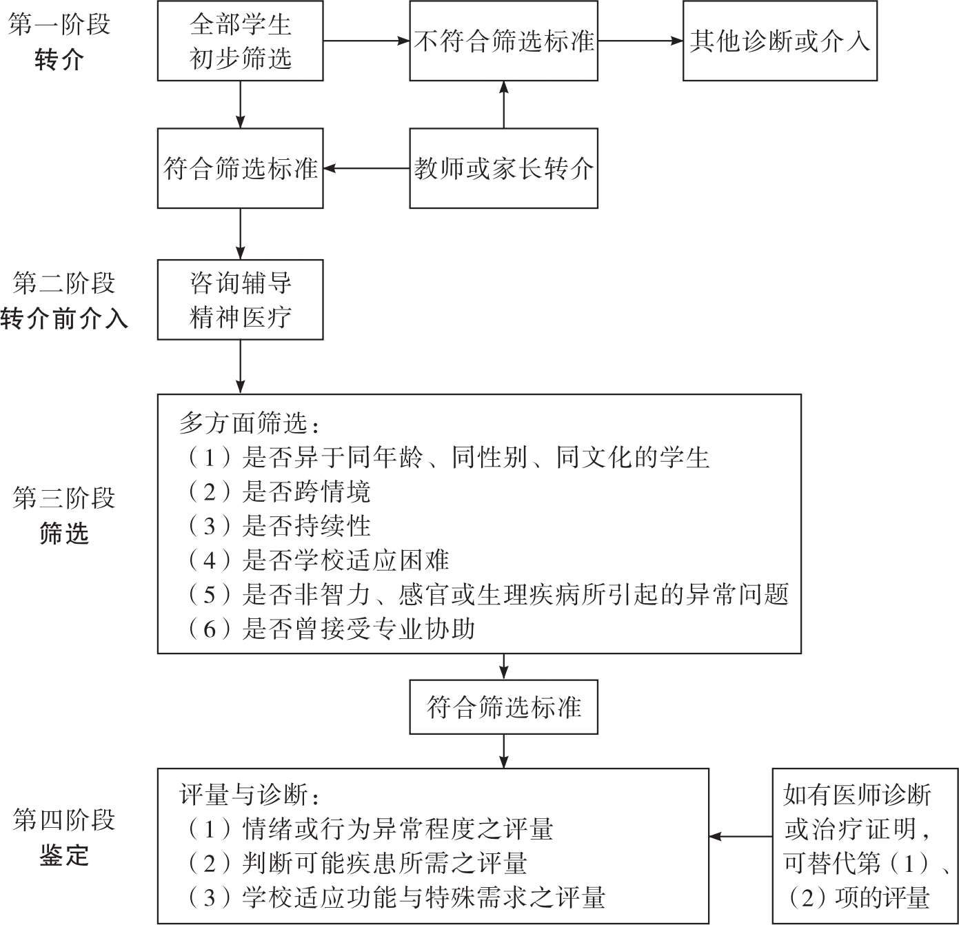 遇到情绪与行为障碍学生,应妥善安排对他们的评估、鉴定和安置。我们可以通过下图更好地了解其中的鉴定工作流程。