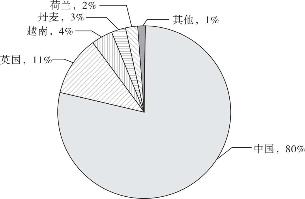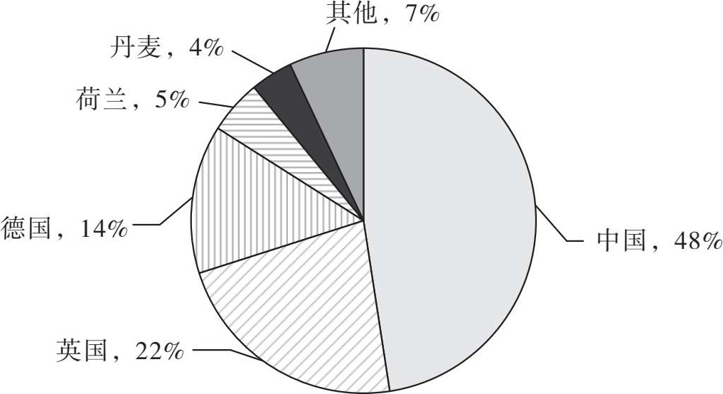 当前全球传统化石能源日渐枯竭,全球气候变化形势较为严峻。海上风电作为新能源产业之一,具有海上风能资源供应稳定和发电功率大的优势,全球多个国家都在大力推进。国外海上风电探索实践起步于欧洲,1991年丹麦建成最早的海上风电项目,时至今日固定底桩海上风电是欧洲具有成本竞争优势的新能源产业之一,在北海和波罗的海周边分布着发展成熟、配套完善的海上风电产业供应链。2009年,挪威研制出首个漂浮式海上风电机组。21世纪初,欧洲各国建设兆瓦级商用海上风电场并成功实现电力输送;21世纪10年代,国外海上风电装备开始向大型化方向发展。2022年全球海上风电新增装机并网容量880万千瓦,同比下降约58%(见图2-1)。主要原因是得益于2021年中国市场的风电抢装潮,当年全球新增海上风电装机容量80%来自中国(见图2-2),2022年,中国市场增速放缓导致全球海上风电新增容量有所回归。截至2021年底,中国海上风电累计装机容量在全球份额占比近一半(见图2-3),中山市风电装备制造企业明阳智能目前已处于全球风电制造龙头地位。