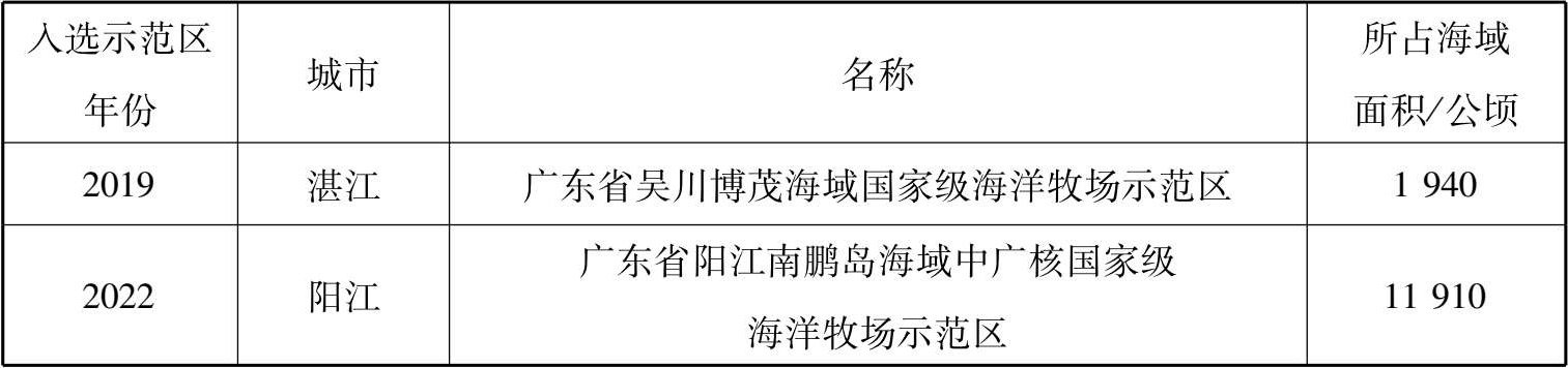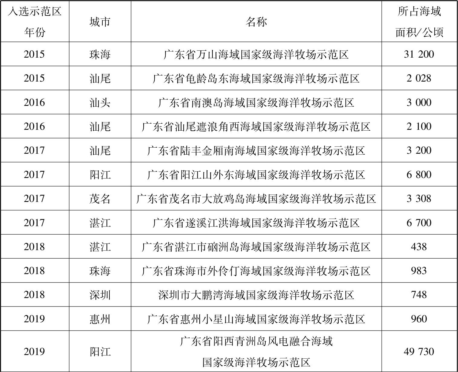 广东省海洋牧场建设已形成规模,养护型国家级海洋牧场数量居全国第一。中国从2015年开始组织创建国家级海洋牧场示范区,截至2023年底,全国169个国家级海洋牧场示范区中广东省有15个(见表2-1),粤港澳大湾区城市中珠海有2个,深圳和惠州各1个。阳江市3个国家级海洋牧场中有2个重点开发风渔融合项目;江门初步投资探索构建海洋牧场产业体系;台山海洋牧场(一期)正在建设中;广州南沙正在谋划建设华南现代化海洋牧场产业科技创新中心,为省内海洋牧场产业供应链提供综合服务。