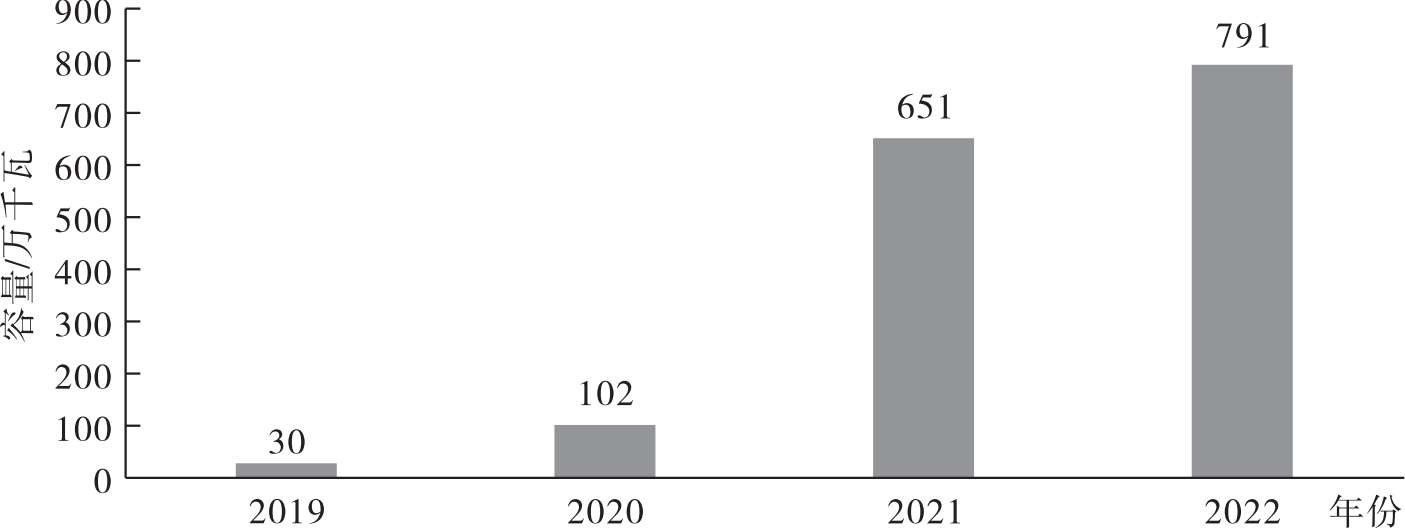 图2-7 2019—2022年广东省累计建成投产海上风电装机容量