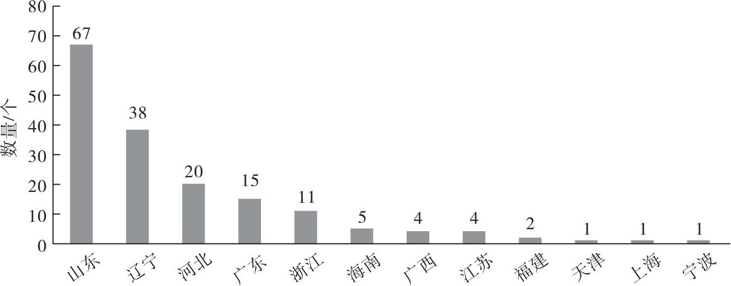 自2019年以来,国内除了广东阳江、揭阳、汕头、江门和深圳等城市在探索建设海洋牧场与海上风电融合发展项目之外,山东潍坊、山东莱州、江苏射阳、福建平潭等地也在探索实践的不同阶段当中。中国近年来大力发展海洋经济,各沿海地区积极推动海洋牧场建设探索现代化海洋渔业模式。截至2023年底,中国共建成169个国家级海洋牧场示范区(见图2-4),其中山东省67个,在数量上遥遥领先。广东省现有国家级海洋牧场示范区数量上在全国排名第四,拥有较好的发展基础。
