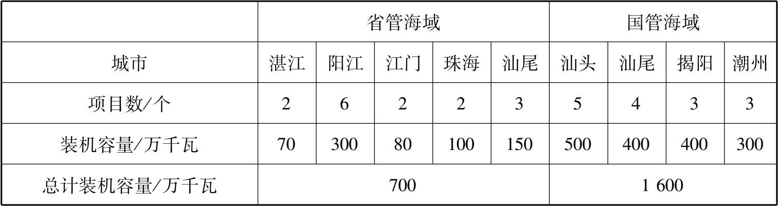 广东省海上风电项目逐渐迈向深远海海域,《广东省2023年海上风电项目竞争配置工作方案》中,共提出30个项目(见表2-2),总计装机容量2 300万千瓦,其中粤港澳大湾区的江门和珠海各有2个项目,装机容量共180万千瓦;方案中位于国管海域的项目15个,标志着广东省海上风电开发项目正从近海海域迈向深远海海域。