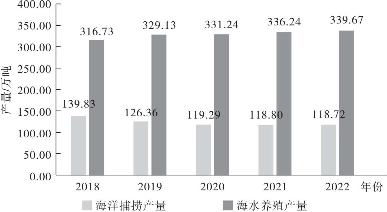 图2-6 2018—2022年广东省海洋捕捞和海水养殖产量