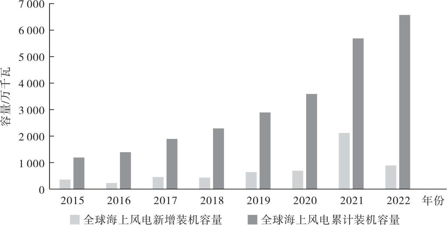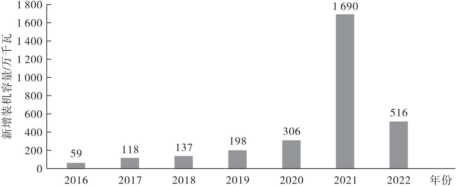 《“十四五”可再生能源发展规划》提到我国将在山东、长三角、福建、广东、广西等地开发建设千万千瓦级海上风电基地,推进重点项目集中连片开发,并推进深远海海上风电平价示范。2021年是国家补贴海上风电的最后一年,2022年新增装机数量骤减(见图2-5),平价时代到来,海上风电行业面临着一些挑战。中央补贴中断使得业内企业要通过规模化生产实现进一步降本增效,而这可能导致行业集中度进一步提高,也驱使海上风电行业通过与海洋牧场协同开发,利用海洋牧场的收益来补贴海上风电高昂成本。由于海上风电补贴政策,海上风电项目在多个地区获得政府和企业的青睐,补贴中断一定程度上会在短期内影响海上风电新增装机规模和增速,但随着国内能源结构转型大势所趋,海上风电规模仍将增长。
