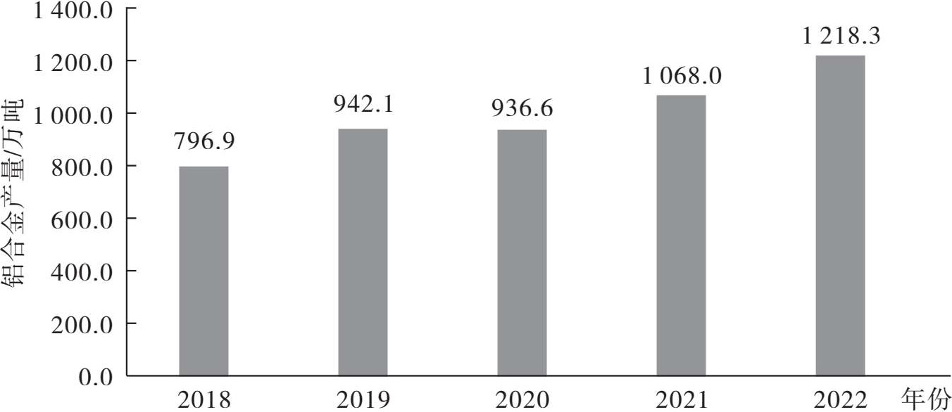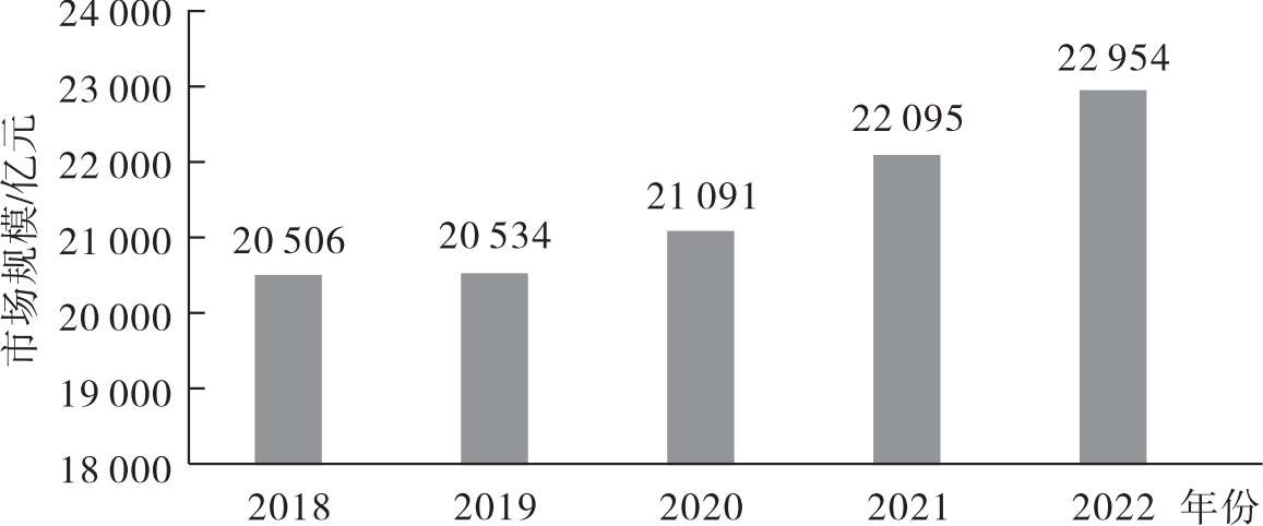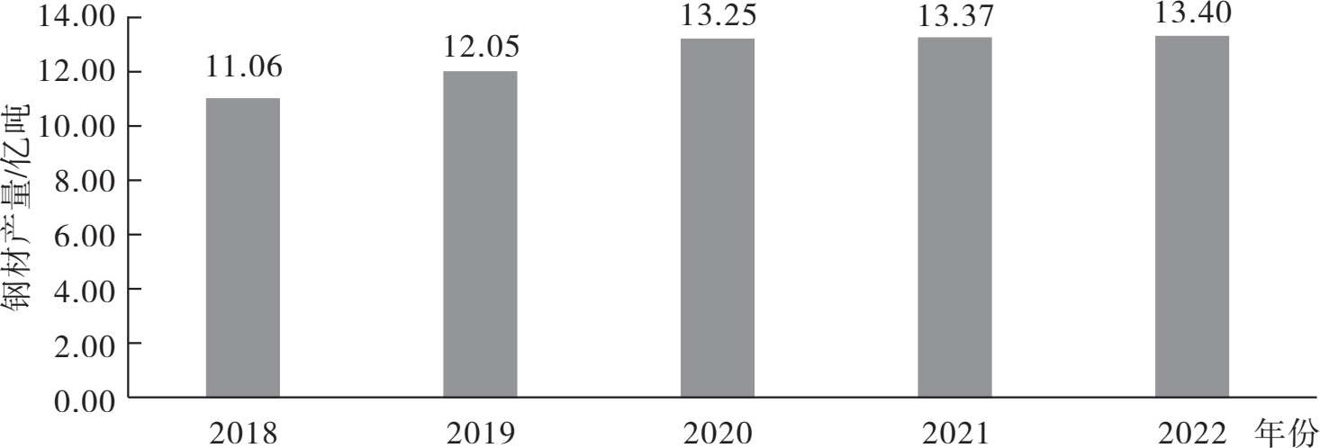 海洋工程装备上游包括海洋工程装备设计、原材料、核心零部件及系统。海洋工程装备产业链中,技术含量最高的环节是海洋工程装备设计。目前,欧美企业掌握着上游方案设计、装备设计以及核心零部件的关键技术,是全球主要的海洋油气开发工程总承包商,在海洋工程装备制造业处于寡头垄断地位。海洋工程装备上游的主要原材料包括钢材、铝合金和电子元器件。其中,钢材是由钢坯、钢锭经过压力加工而成的材料,可形成一定的形状、性能和尺寸。近年来,我国钢材产量呈稳步增长态势。图1-7数据显示,2022年中国钢材产量达13.4亿吨,同比增长约0.27%。铝合金用途广泛,可运用在航空航天、机械制造等工业领域。而我国一直是铝合金生产大国,2018—2022年我国铝合金产量如图1-8所示。除了2020年有所回落,这几年我国铝合金产量整体呈稳步增长的趋势,2022年我国铝合金产量达1 218.3万吨,同比增长约14%。电子元器件在工业领域的应用十分广泛,是现代电子工业的基础。近年来,我国电子元器件市场规模模增速迅猛(如图1-9所示),2022年电子元器件市场规模近23 000亿元。