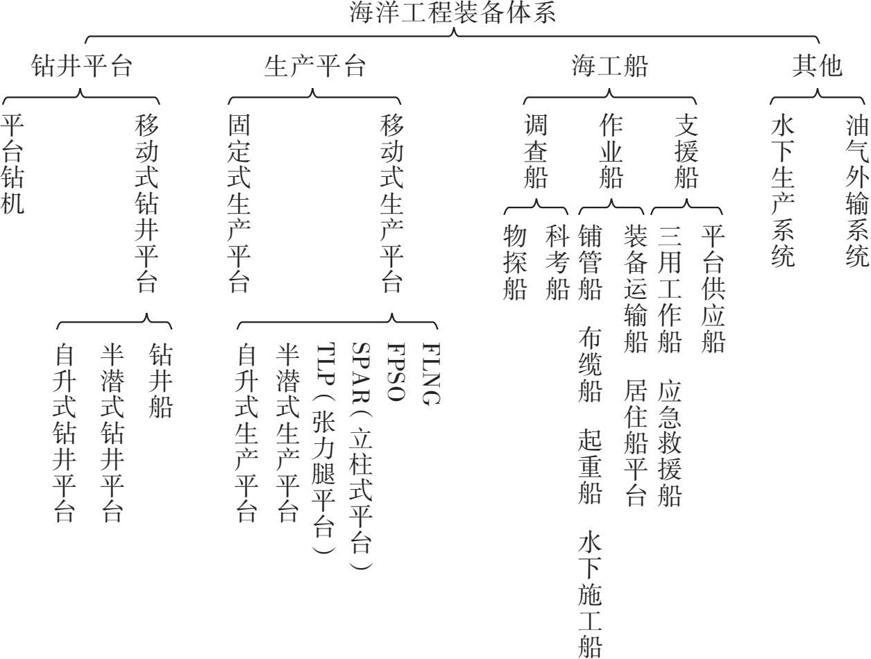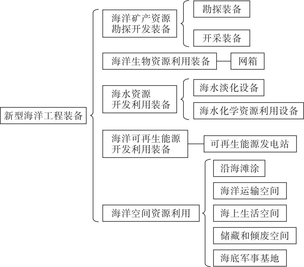 从广义上讲,海洋工程装备是人类在开发、利用和保护海洋所进行的生产和服务活动中使用的各类装备的总称,是开发和利用海洋的前提与基础,其集合了新材料、电子信息、装备制造等高新技术,产业辐射能力强,处于海洋产业价值链的核心,是世界各国在海洋经济领域竞争的焦点。海洋资源种类丰富,主要包括六个方面,分别是海洋石油资源、海洋生物资源、海洋固体矿物资源、海洋化学资源、海洋可再生资源、海洋空间资源。与以上海洋资源开发相对应的新型海洋工程装备可划分为:海洋矿产资源勘探开发装备、海洋生物资源利用装备、海水资源开发利用装备、海洋可再生能源开发利用装备、海洋空间资源利用,详见图1-2。