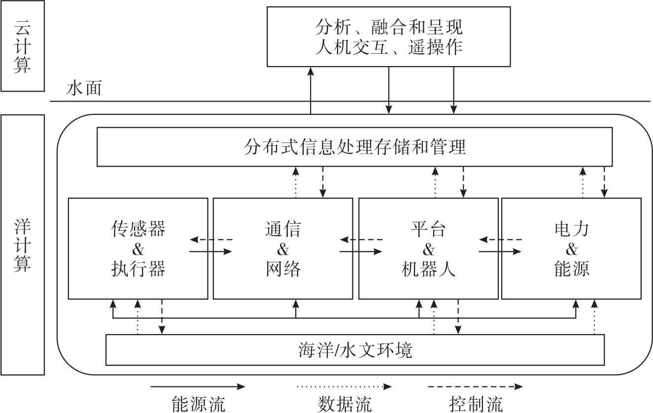 海洋应用系统(云):以各种云平台、数据中心、应用系统软件的形式呈现,包含云链路、数据中心、大数据存储、智能分析与决策等。如机舱自动化系统、船舶操舵控制系统、海工作业管理平台、智慧港口管理平台、远程监控管理系统等。