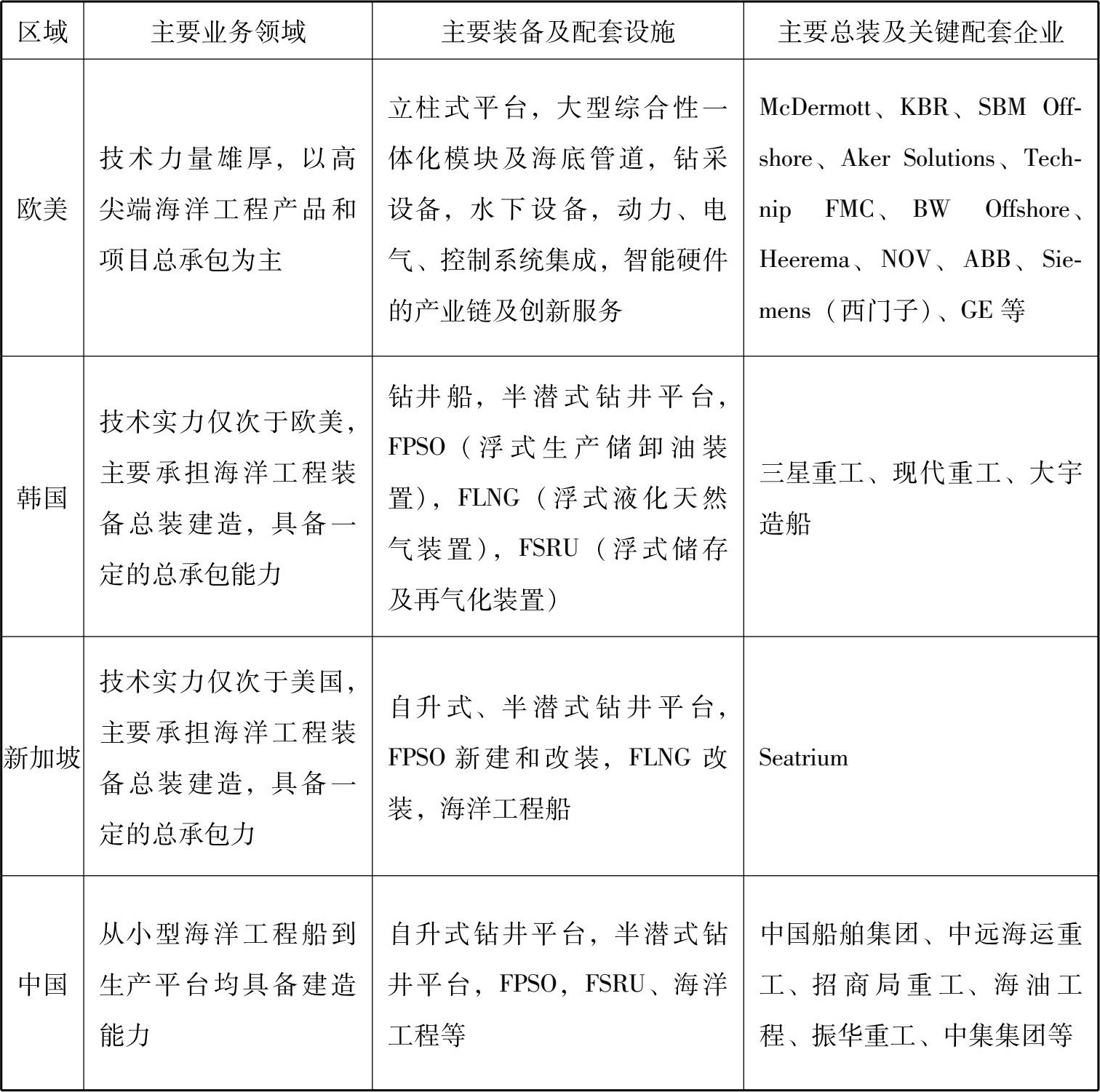 全球海洋工程装备制造业主要集中在美国、欧洲、新加坡、韩国等国家和地区。发展高投入、高风险的海洋工程装备须建立在资金、建造设施、研发机构、建造经验完备的基础上。当前,美国、欧洲、新加坡等全球海洋工程装备制造龙头以研发、建造技术含量较高的深水、超深水平台装备为核心。韩国海洋工程装备建造则集中在三大船厂(三星重工、现代重工、大宇造船),以高价值量的浮式生产装备和钻井平台为主;新加坡两大船厂吉宝岸外与海事、胜科海事已完成合并(合并后更名为Seatrium),产品以自升式钻井平台和生产装备为主;中国船厂众多,产品种类最为齐全,从几千万美元的小型海洋工程船到数十亿美元的生产平台均具备建造能力(见表1-3)。