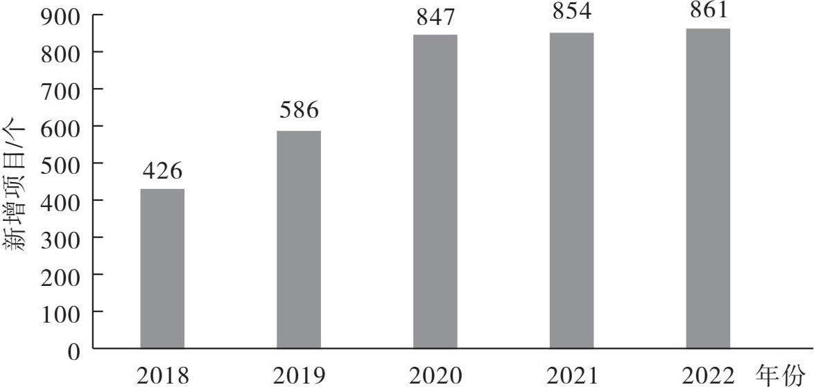 我国海洋工程新增项目稳步增加。随着海洋工程装备需求量的增加,近年来,我国海洋工程新增项目也呈增加趋势。图1-5的数据显示,2018—2022年中国海洋工程新增项目持续增加。