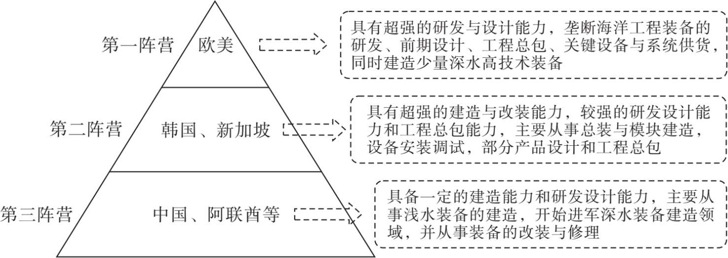 全球海洋工程装备制造业以欧美为主导,并逐渐向亚洲地区转移。从总装建造看,目前已形成中国、新加坡、韩国三足鼎立的局面,三国包揽了全球80%以上的市场份额。一直以来,欧美国家都是海洋资源开发的引领者,走在海洋工程装备制造的前列。随着全球制造业向亚洲国家转移,欧美企业保留了如设计、核心系统制造、总包等价值高的核心技术,让渡产业链的中低端部分。此外,欧美企业也基本垄断其运输、水下生产系统安装、深水铺管等。目前,欧美企业仍掌握着设计、装备制造、工程建设的主导权,是全球最主要的海洋油气开发总承包商。海洋工程装备制造业具有技术的先发优势性,欧美企业倾向选择具有技术优势的企业进行研发、设计,客观上巩固、增强了欧美在技术上的领先地位,延续其在核心技术上的垄断优势。长期以来,欧美设计、欧美总包、欧美配套的状态和格局已经形成。对于我国而言,配套自主研发和推广应用之路较为坎坷。在短中期内,我国海洋油气装备水面、水下关键系统和设备基本依赖欧美国家的局面难以出现根本性改变。从全球范围来看,海洋工程装备市场已经形成了由三大阵营组成的“金字塔”竞争格局。我国海洋工程装备制造业现有的三大产业集群竞争力弱,集聚效应尚未有效发挥,整体实力处在全球海洋工程装备市场的第三阵营(见图1-3)。